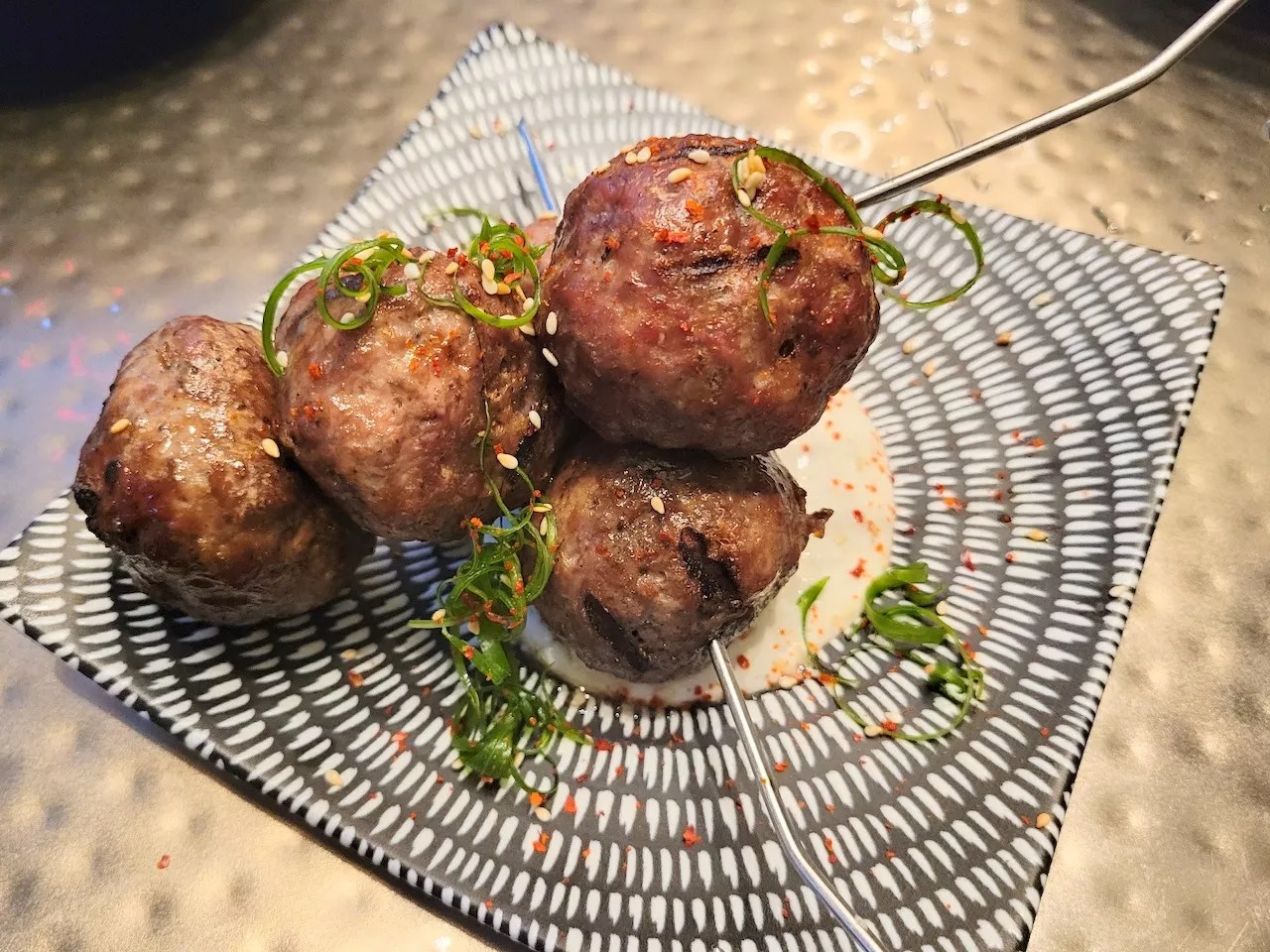 We wanted to try items from different regions, so we started with the Egyptian spiced lamb skewers ($15), which are probably best shared with others. These massive scrumptious spheres are made with dukkha spiced ground lamb, sesame seeds, pink peppercorn and pork, even though the latter is not traditional meat found in lamb dishes. These balls of lamb come with a small smear of mild labneh sauce, which is a Middle Eastern cheese made from strained yogurt. The lamb was cooked exceptionally well for the Texas-size portion, we just wish there was more of that savory sauce to accompany it.