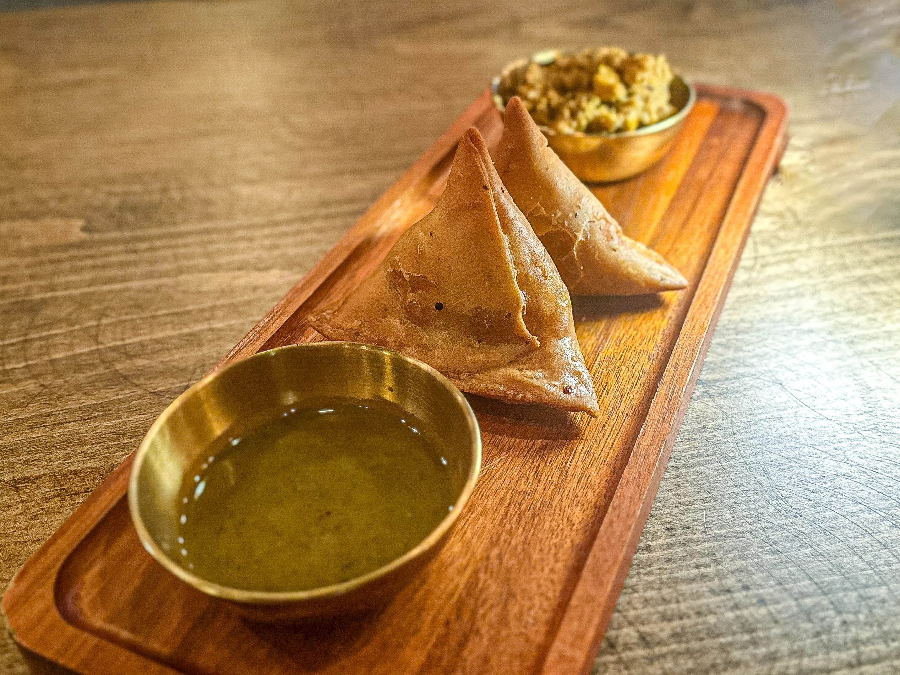 Vegetable samosas were next; they come two to an order along with some mint chutney and chana dal. Not too big, not too small, just enough for two bites each. The chana was really good as well. Other appetizers include fries, pani puri, spicy potatoes, wings, lentil soup and fattoush salad.