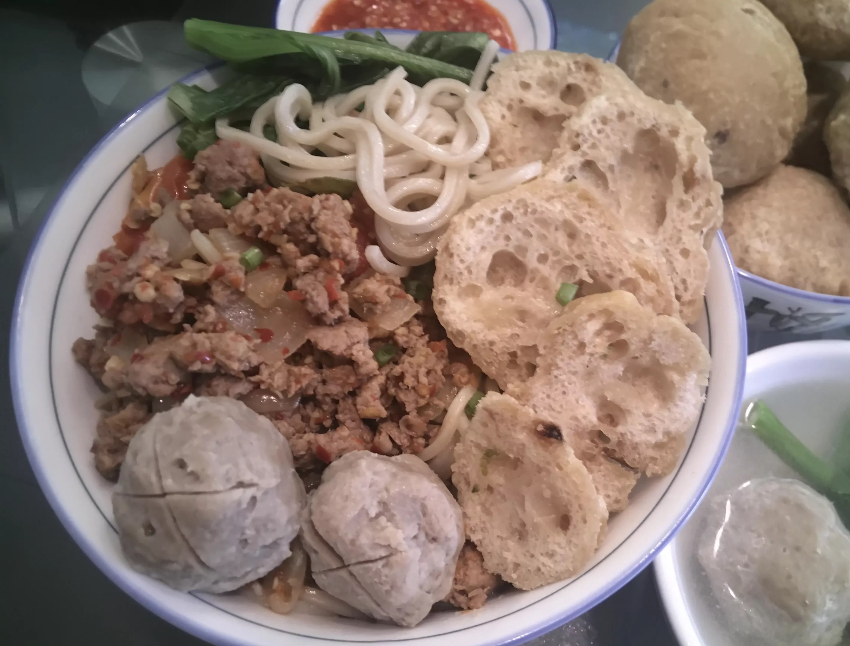 Noddle topped with spicy chicken rica sauce, bakso (meatball) and fried fish balls