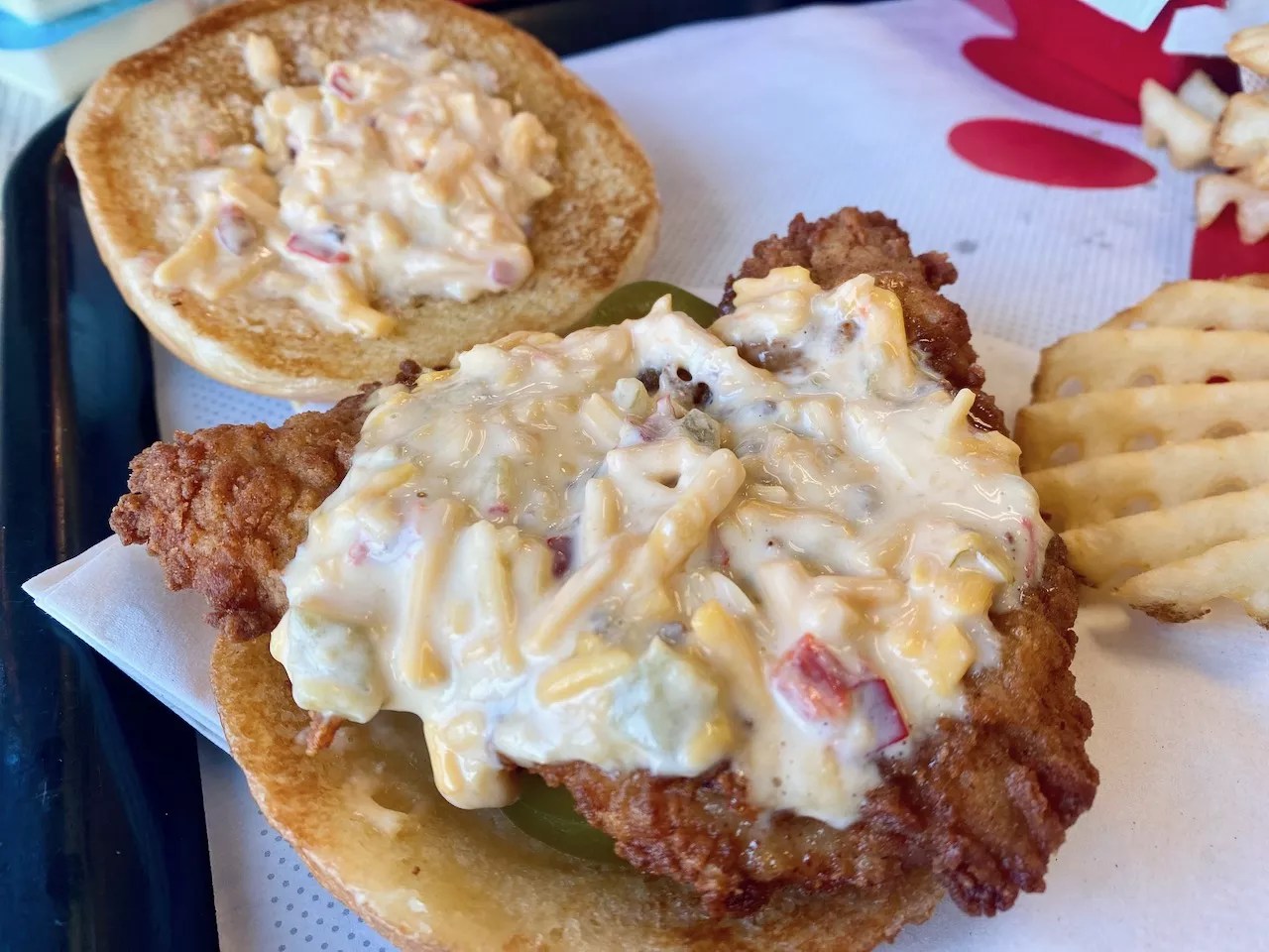 The final recipe for this latest menu item calls for a “custom-made by Chick-fil-A” pimento cheese, highly reminiscent of H-E-B’s, with sharp cheddar, green chilis and red pimentos. And for the first time Chick-fil-A history, the chain is using jalapeños on an entree; several slices of pickled jalapeños dot the bottom bun.