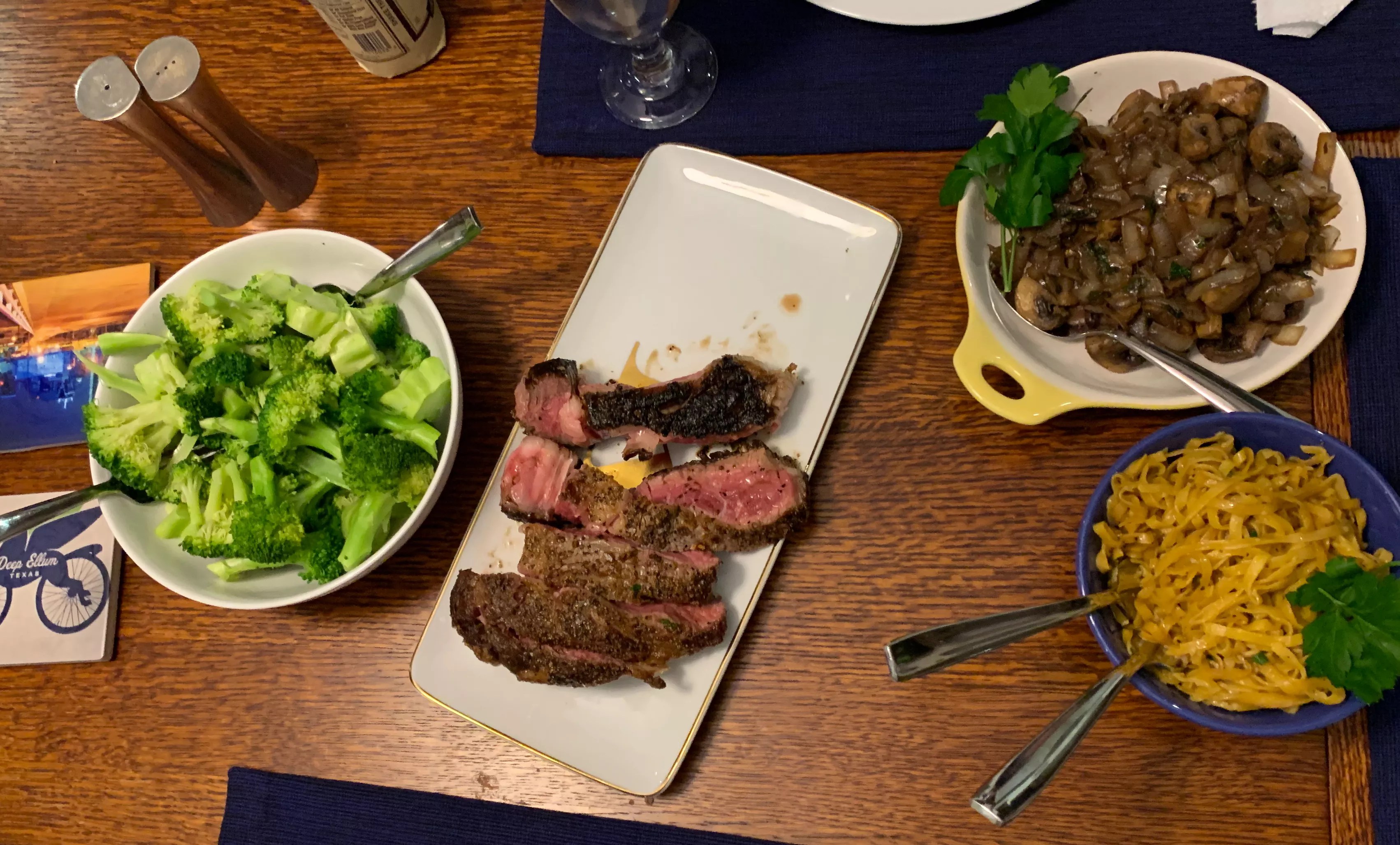 A Friday night dinner spread, with shelter in place: steak from Knife, steamed broccoli, sauteed mushrooms, plus garlic noodles from Mot Hai Ba.