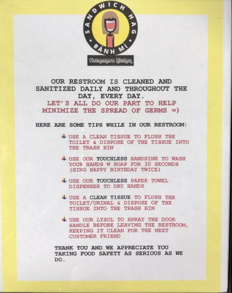 “I think because I’ve always shared my health inspection scores, my customers trust that we’ve always taken food safety seriously,” Sandwich Hag owner Reyna Duong says. “And with this, I’m taking that extra step of transparency to show I’m also asking for our customers to take it seriously by sanitizing before they sign [the digital screen for checkout], using our Lysol before touching the door handle with clean hands, etc.”