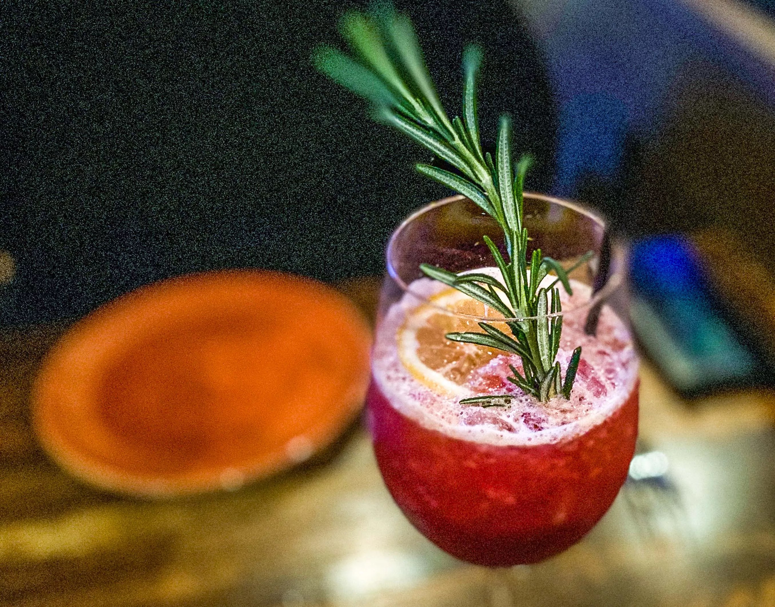 The Moon-Dance cocktail is made with gin, Aperol, lemon, blood orange purée, rosemary, simple syrup and cardamom bitters.