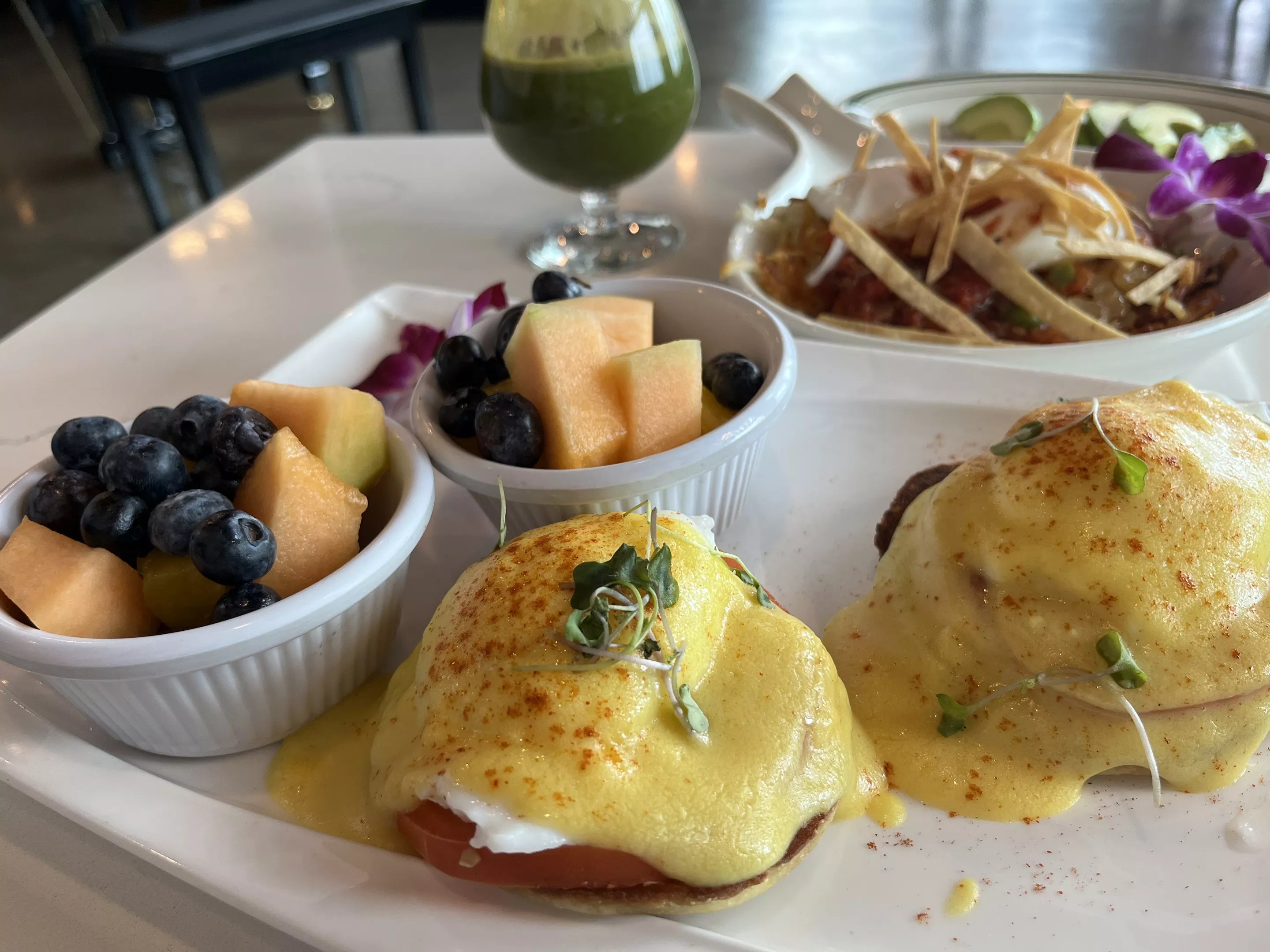 Omelets, skillets and Benedicts are just some of the other brunch specialties on the menu here. A taco omelet ($15.49) comes loaded with taco meat, salsa and sour cream. The steak and eggs plate ($21.99) is piled high with a juicy 8-ounce steak and two eggs cooked your way with a side of home fries. Talia’s version of breakfast potatoes presents a buttery soft interior surrounded by a crispy shell. Eggs Benedict served on toasted English muffins with a side of freshly cut fruit. Anisha Holla