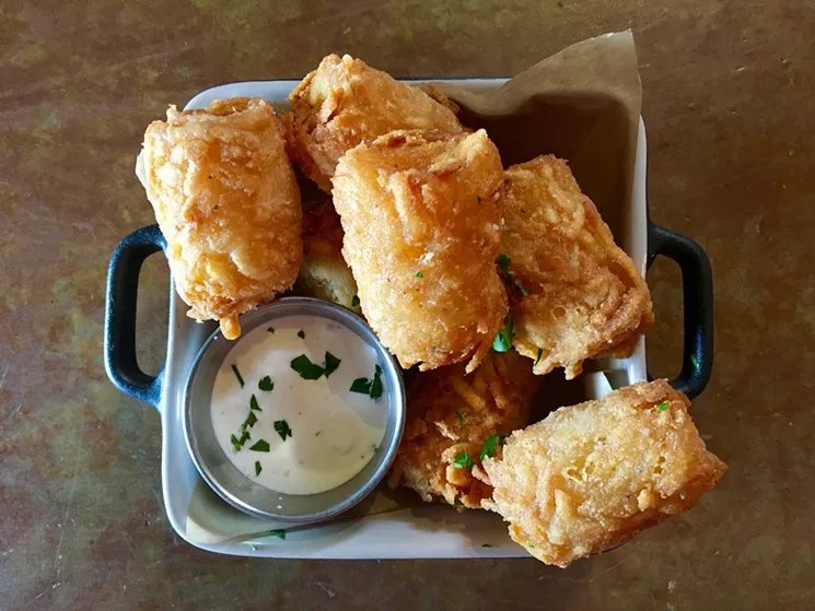 Chef Ray Skradzinski starts with a potato hash shred. Then, he shaves Gruyère cheese into the hash and dashes in nutmeg, cayenne and a pinch of salt. He lets that sit with some cornstarch, scoops the mixture and hand-forms mini barrel shapes. To order, the barrels get a light coat of cornstarch and head into the deep fryer. A crisp shell forms. They will put every other tater tot in city limits to shame.