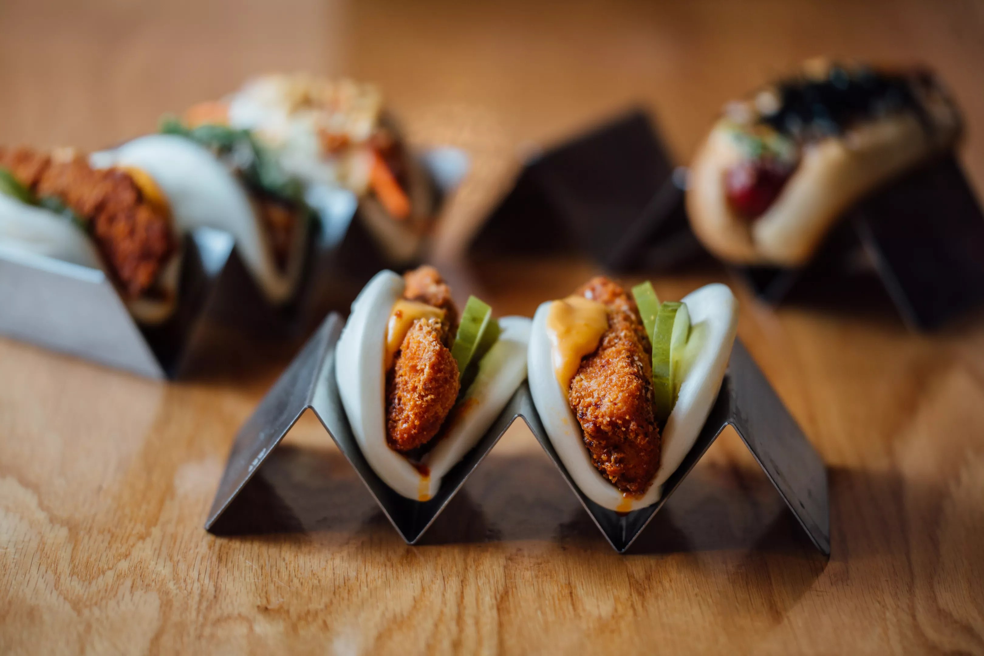 Best Cheese Covered Potato to Dip in Ranch The beef burger bao (right) is topped with American cheese that’s made in house at Junction Craft Kitchen. Bun Stop