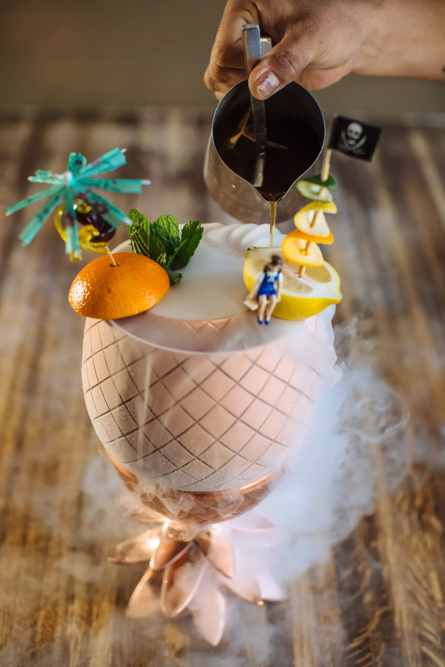 Rapscallion’s Ghost Armada, a new drink on their expanded tiki menu coming out next month, is made with gin, dark rum, house-made falernum, lemon, ginger, Creme de Cassis and bitters, and it comes with cute garnishes and a full-on smoke show. The drink, meant to be shared, will be offered on Tuesdays.