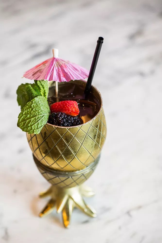 Don Quixote ($12) has one of the prettier presentations at the bar. It is served in a heavy, golden pineapple cup that comes apart like a Russian stacking doll. The bottom half of the cup contains the drink, which has rum, gin, brandy, orange, lemon and macadamia coconut orgeat. Orgeat is a sweet syr