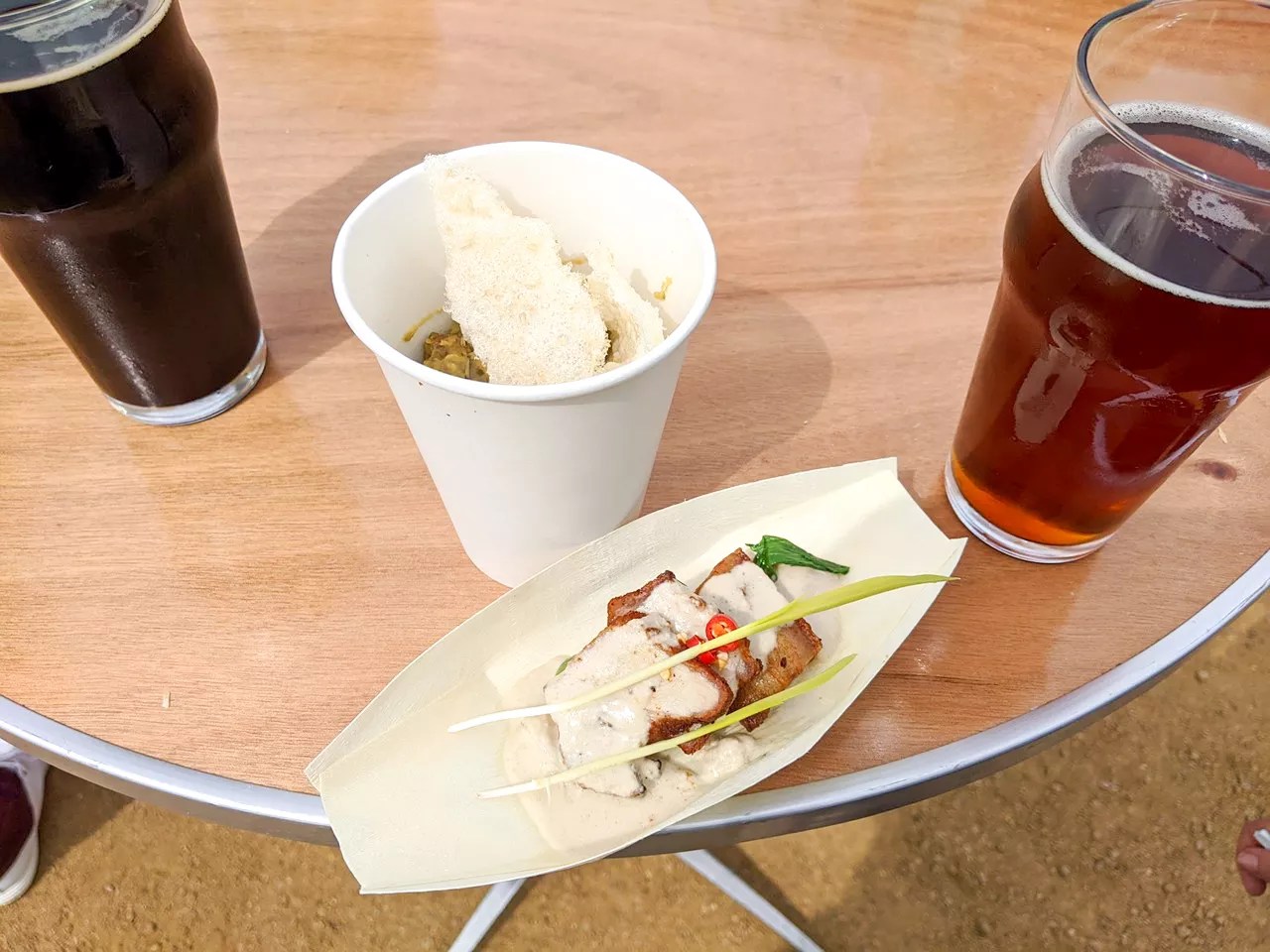 Two bites from Not Your Lola’s alongside two beers from Four Corners. (Dear Four Corners, If you’re reading this, keep the brown ale around for a while.)