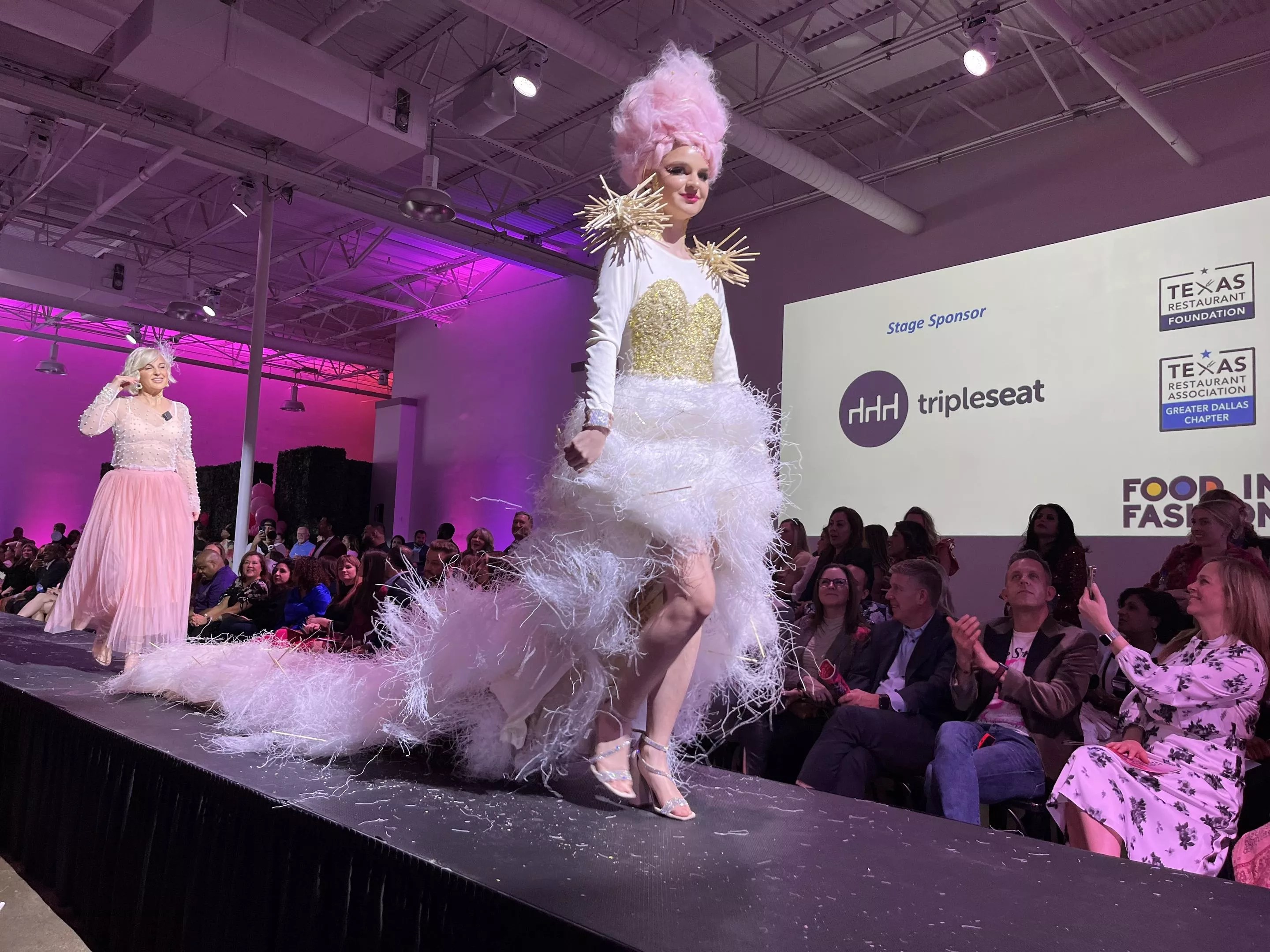 Hundreds of guests gathered at On the Levee last Tuesday for Dallas’s 7th Annual Food In Fashion event celebrating two iconic Dallas industries. Hosted by the Greater Dallas Texas Restaurant Association, the gala presents a show of more than 15 models, each dressed in over-the-top costumes representing local Dallas restaurants. Contenders this year ranged from the Velvet Taco model – wearing a taco menu and tortilla chip bags – to Cane Rosso’s clever pizza dough-adorned dress. It’s part sport, too, as all entrants are vying for both the popular and judge’s table vote.