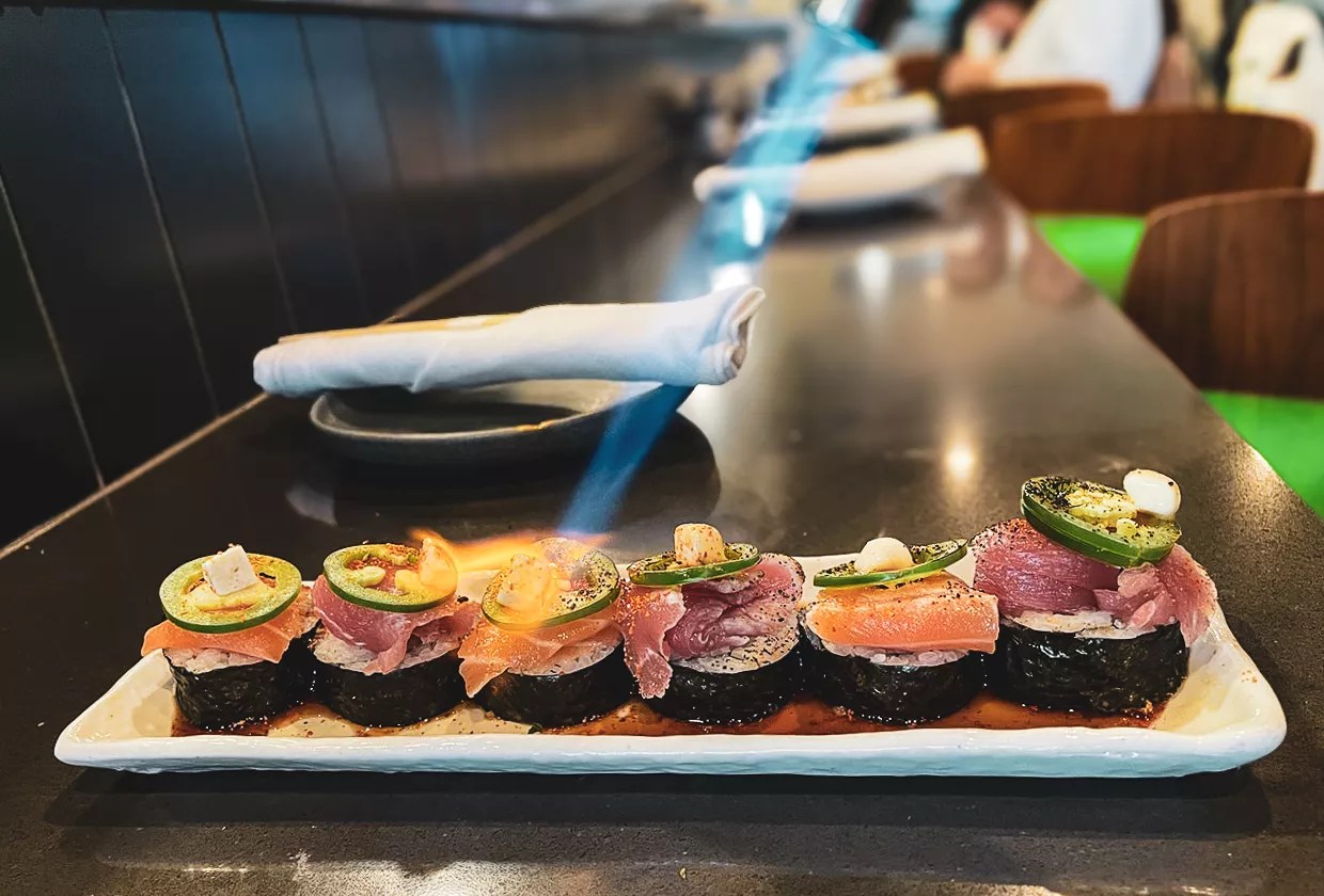 The Kaiyo roll gets a spritz under the blowtorch before being served, adding a touch of smokiness.