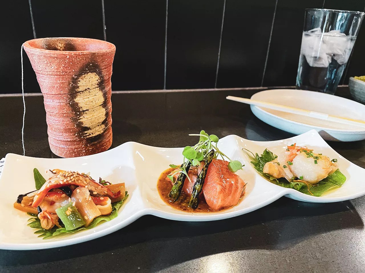 The chef started us off with the san ten mori ($9), which loosely translates to “three different appetizers.”