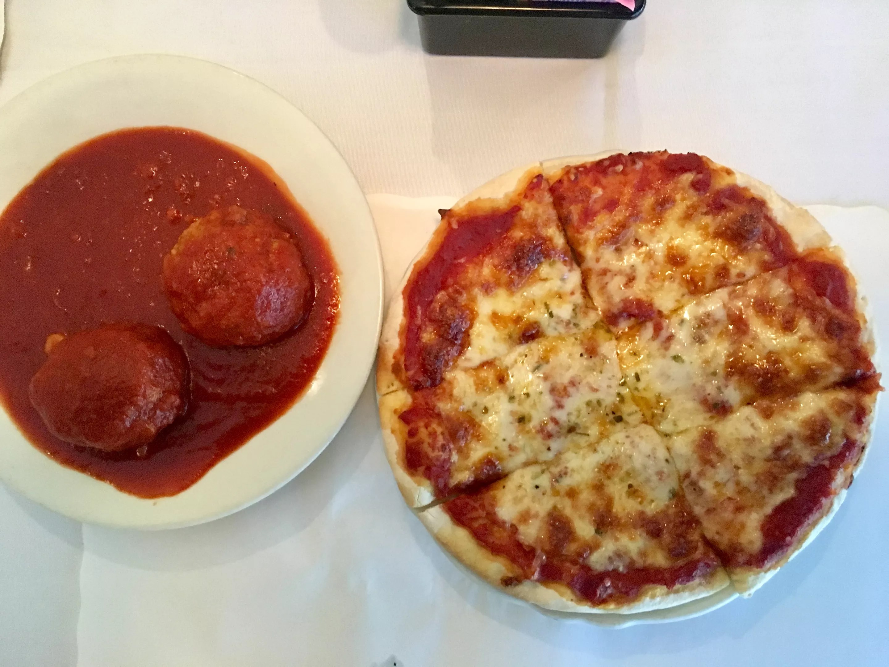 A personal pizza is around 10 bucks with salad at Prego. The side of meatballs is heavy with tomato sauce.