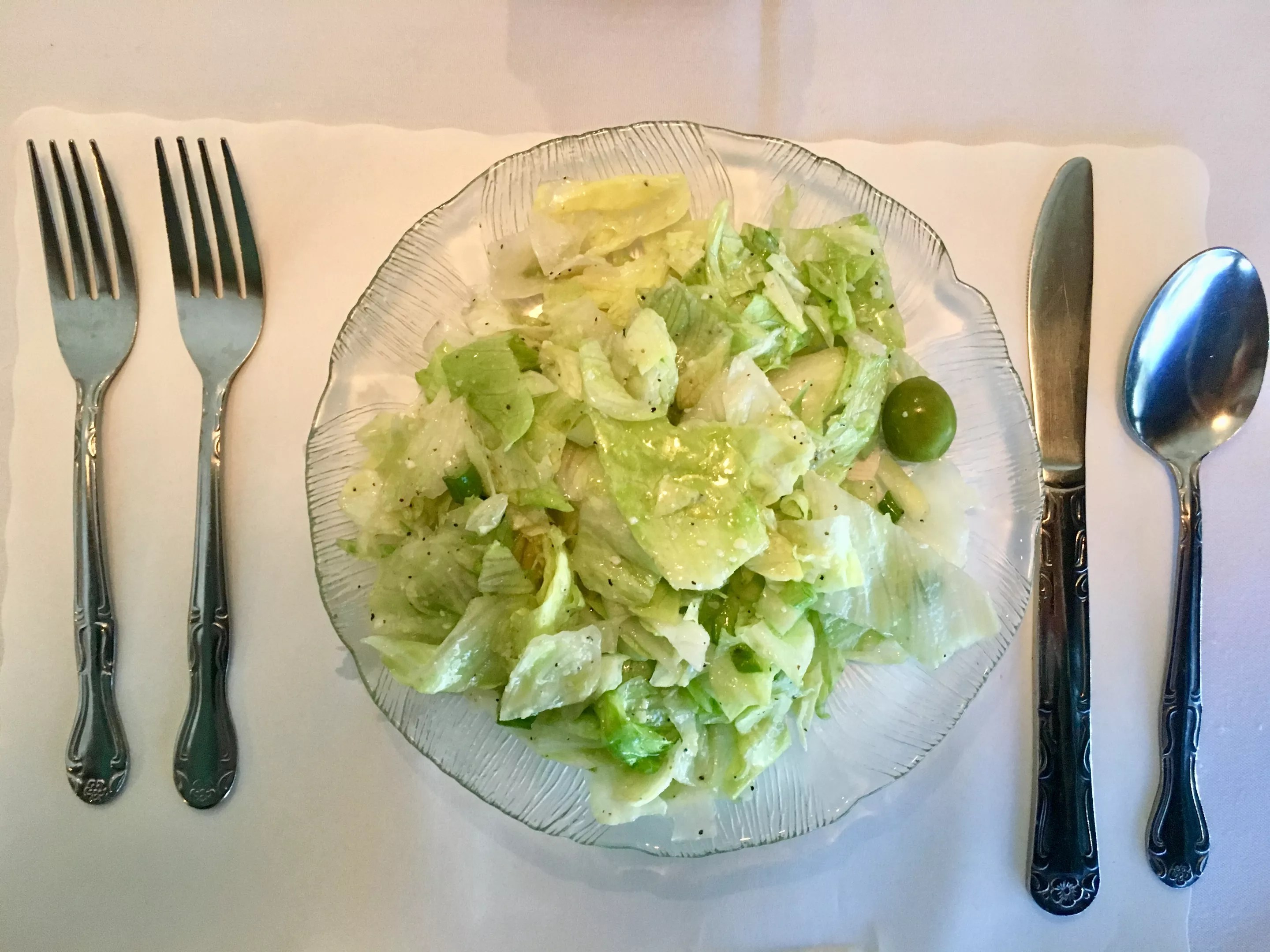 Waiters are in crisp white shirts and ties. White tablecloths and wavy-cut paper place settings greet each diner. I’m in the unchanged dining room around lunchtime. The light fixture that hangs from the ceiling nearly grazes my hair as though people were shorter in 1982 when Prego opened. The ubiquitous green salad drops in front of me, and I can’t help but think we’re one weird food truck away from this salad emerging at a new bar, cheffed-up with house croutons or something.