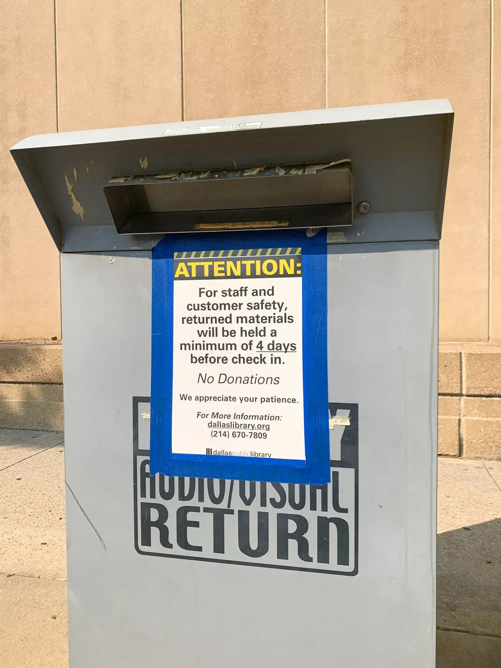 You can return your book by dropping it in the library’s normal drop-off containers. Another aspect that might possibly add to your delay in getting a book: Returned items rest at least four days before an employee picks them up – again, for safety.