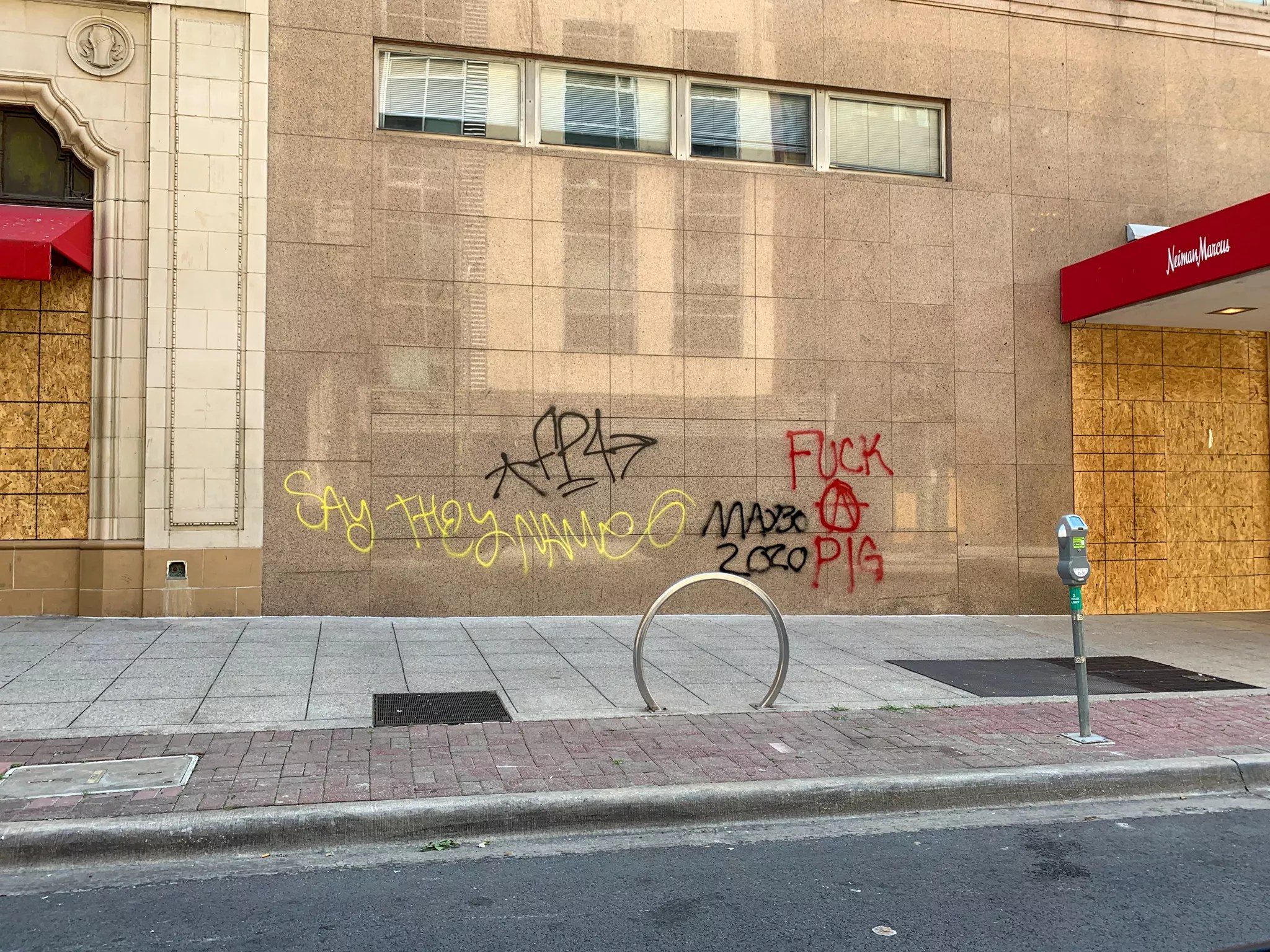 Tagged buildings (such as Neiman Marcus, pictured Sunday morning) appeared clean by Monday morning.