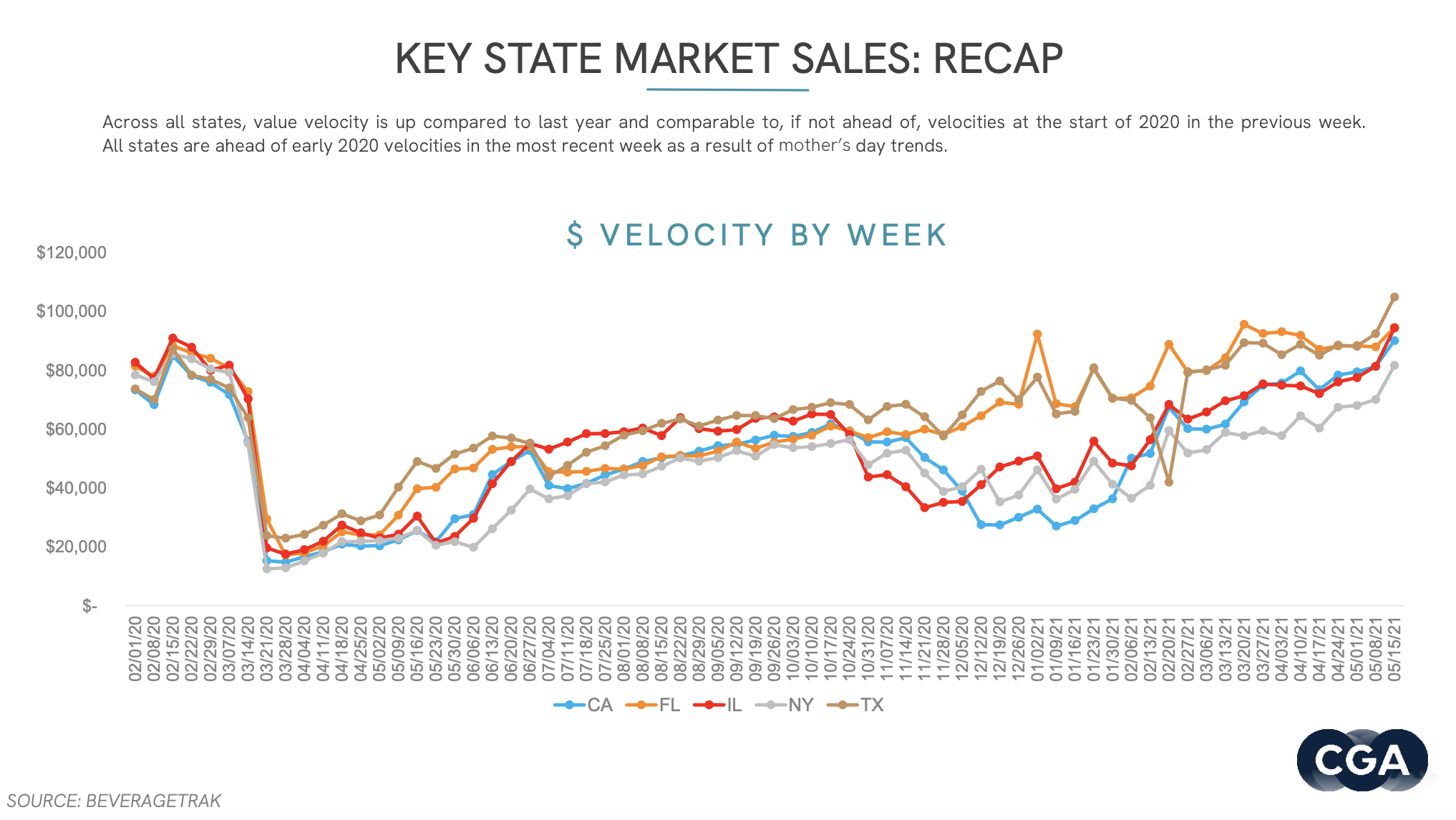 We can also see in the chart above the sharp upward trend of velocity in the first two weeks of May, which included both Cinco de Mayo and Mother’s Day, exceeding pre-pandemic numbers. The week of May 9 to May 15 (which included Mother’s Day) saw a 114% increase in velocity over the previous week.