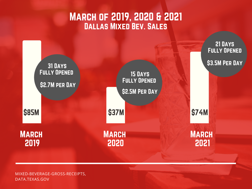 Using the Texas Comptroller of Public Account online query system, we started by looking at February 2021, the last full month of capacity restrictions. Total liquor sales at bars and restaurants in Dallas was $45.8 million in February. In March, that number jumped to $73.7 million, and the restrictions didn’t lift until 10 days into March.
