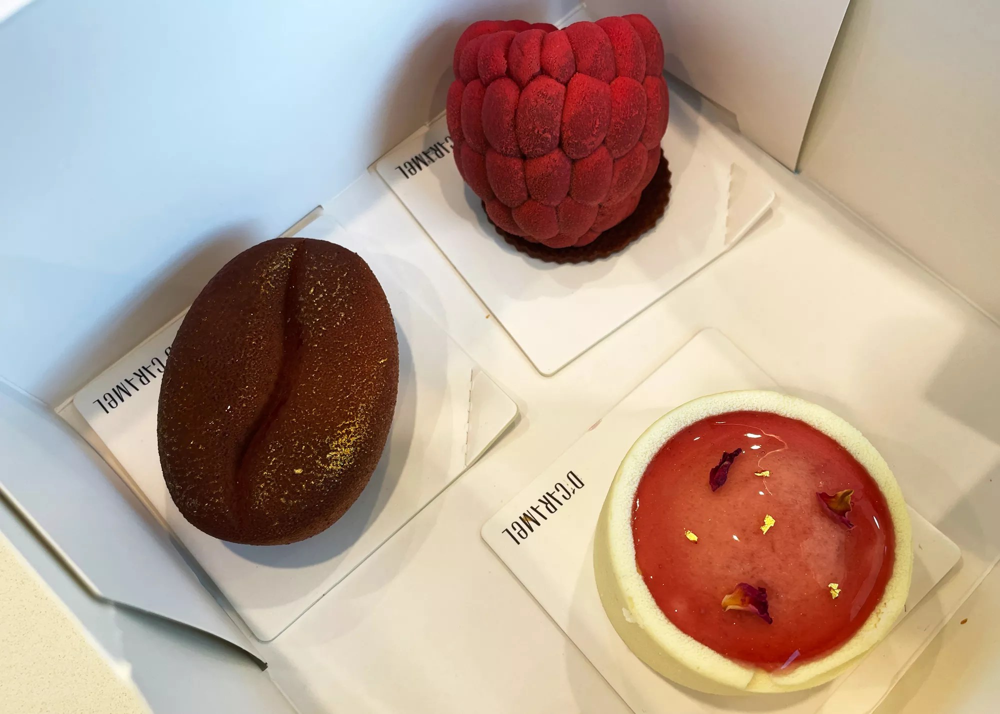 We got the coffee bean, a tiramisu made with mascarpone mousse, coffee cremeux, almond and vanilla crunch and a vanilla biscuit; the lychee and rose with a lychee compote, vanilla mousse, rose glaze, raspberry coulis and a honey biscuit; and the raspberry, which is a dark chocolate and raspberry mousse with a chocolate biscuit and raspberry coulis inside – lastly, an apple yuzu croissant.