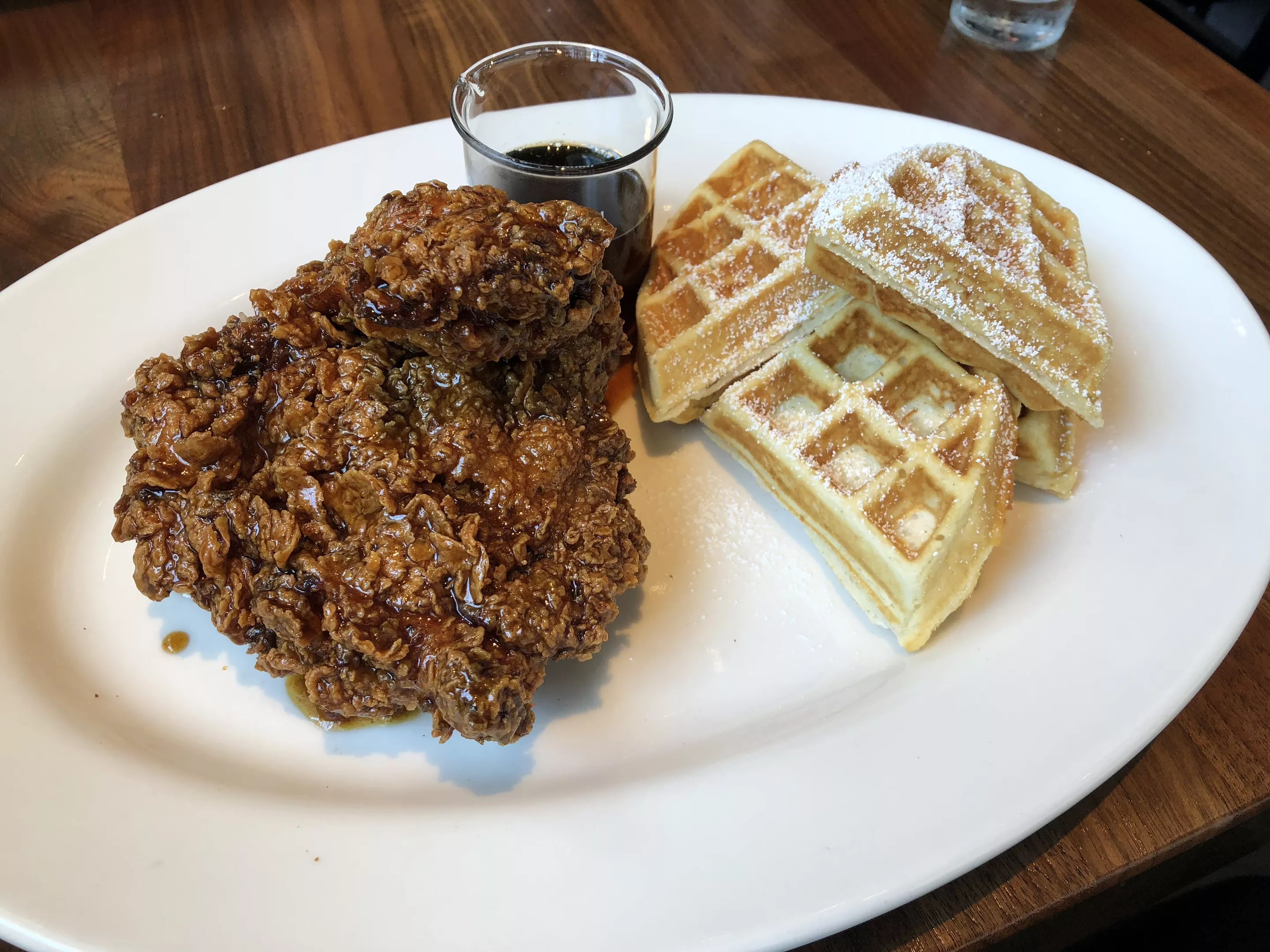 While the fried chicken is fine, that intense flavor doesn’t exactly work with the dense waffle pieces on the same plate, and it definitely battles the syrup for dominance.