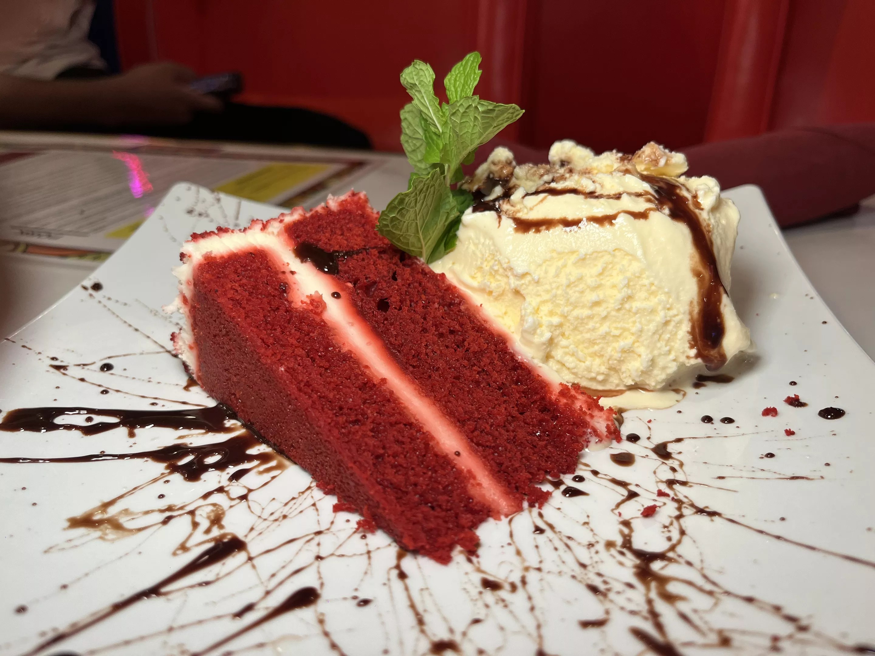 Feast on a red velvet cake, painted with chocolate splatters and served with vanilla ice cream.