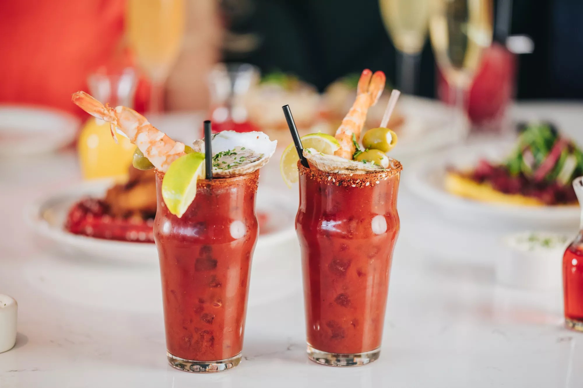 THE Royal Bloody ($17): Tito’s, house-made mix, bleu cheese-stuffed olives, shrimp cocktail, shucked oyster, chili rim