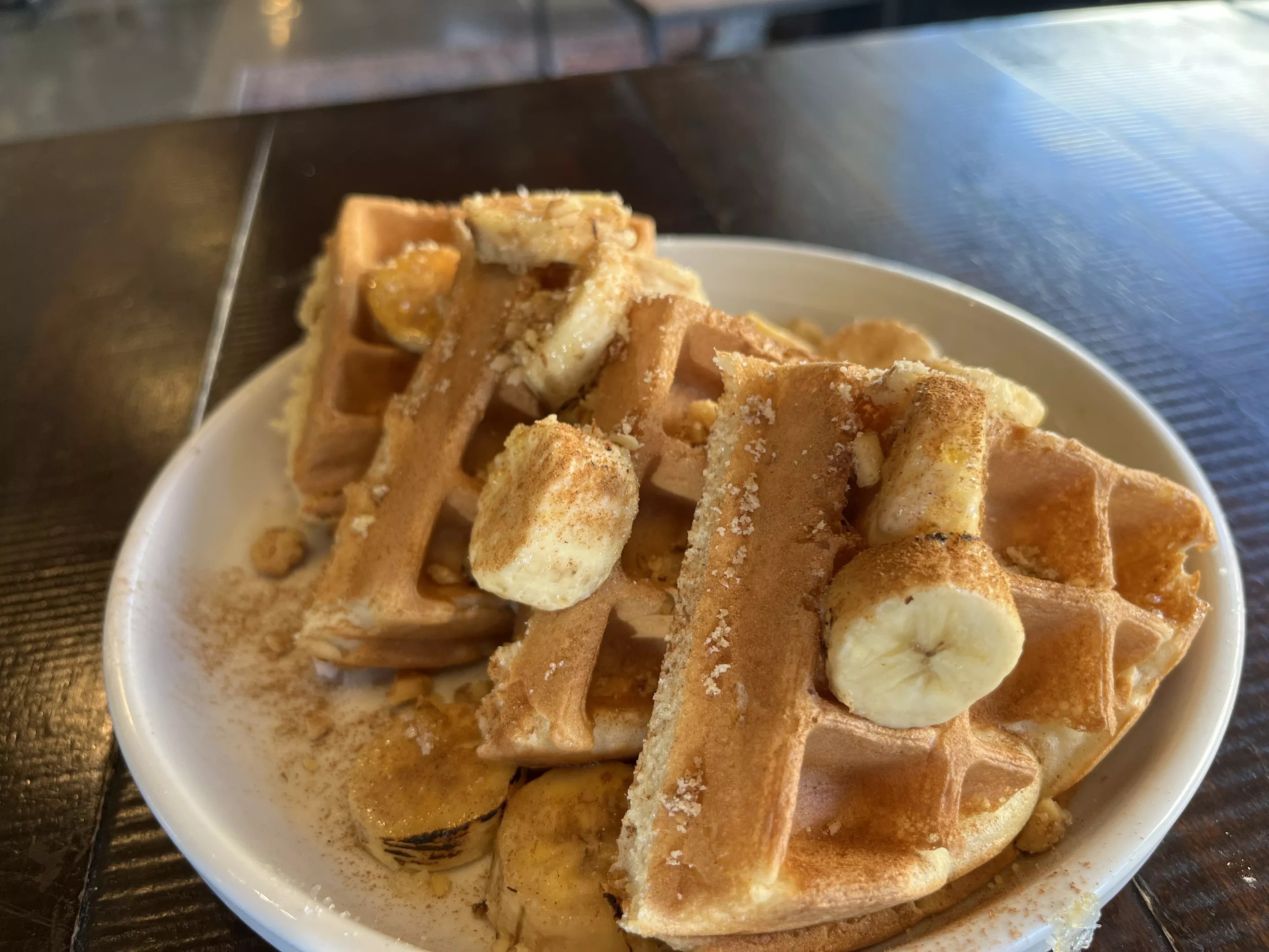 For a sweet coffee pairing, it’s hard to go wrong with one of Duino’s all-day waffles. The banana brulée waffle – the coffee shop’s most popular – is a light waffle topped with caramelized bananas and served with a side of maple syrup.