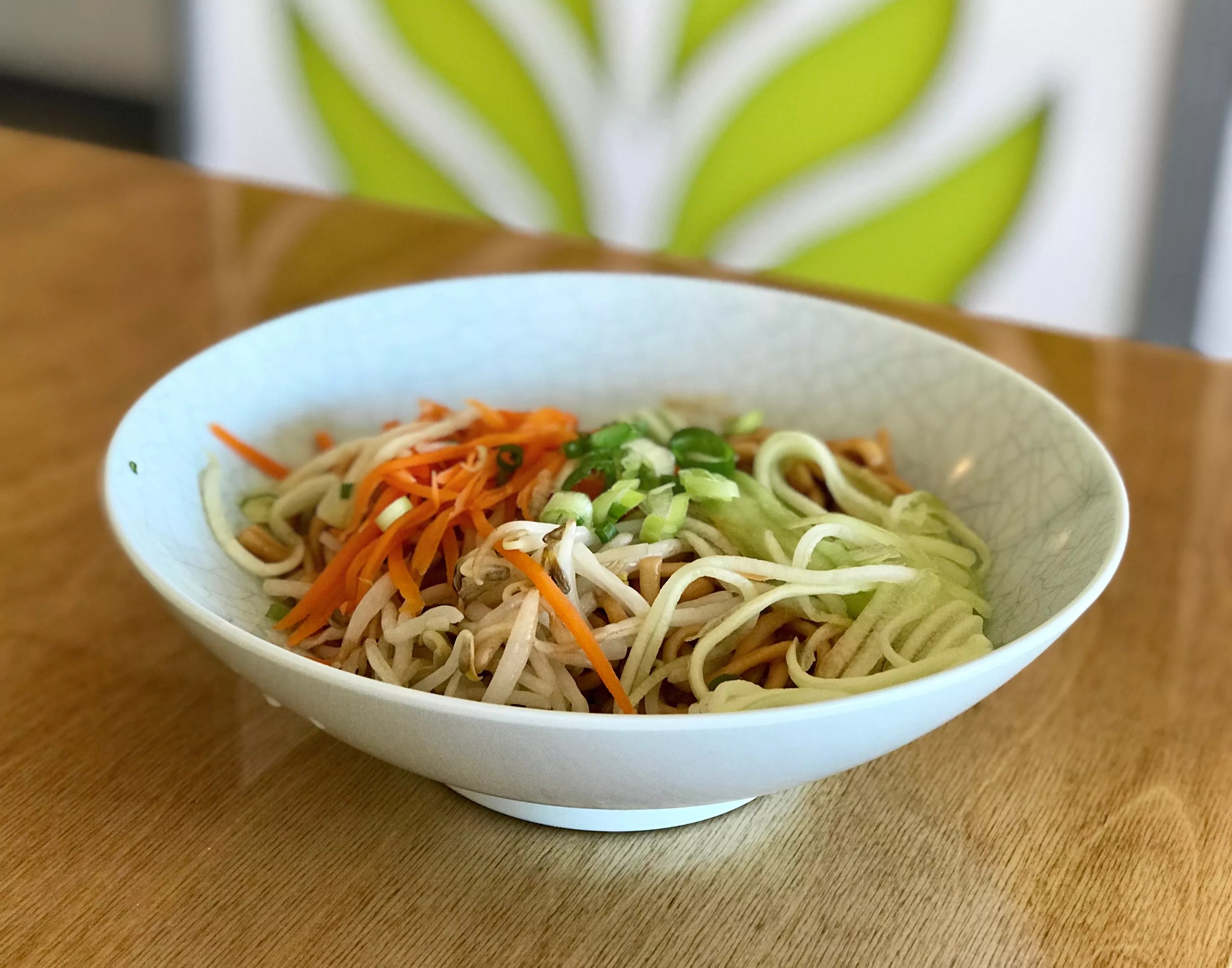 An order of sesame noodles in peanut sauce () includes fresh vegetables.