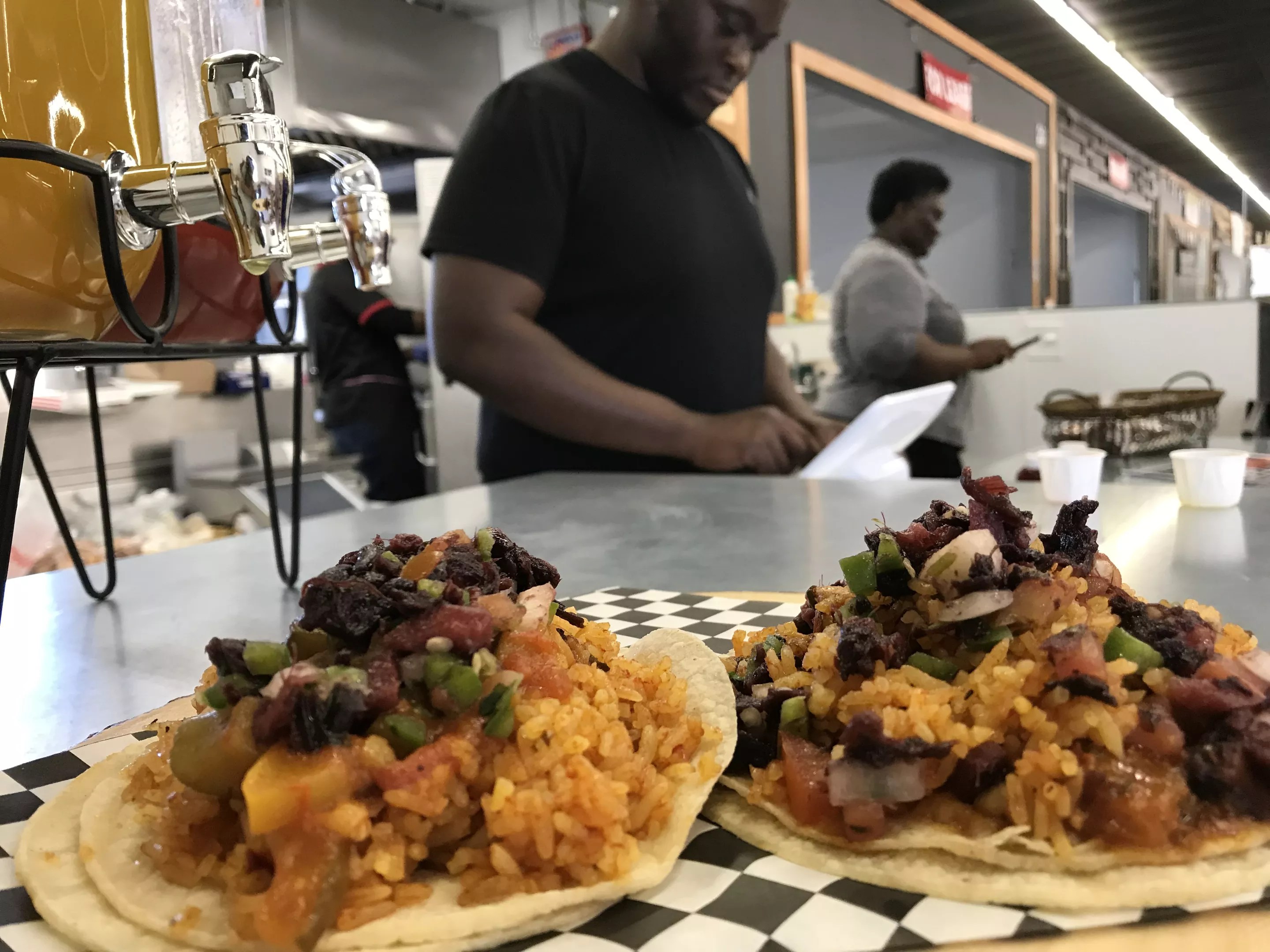 Jollof tacos in the foreground and, in the background, Felix Odu and his mother, Edith, who owns Edylicious in Grow DeSoto Market Place.