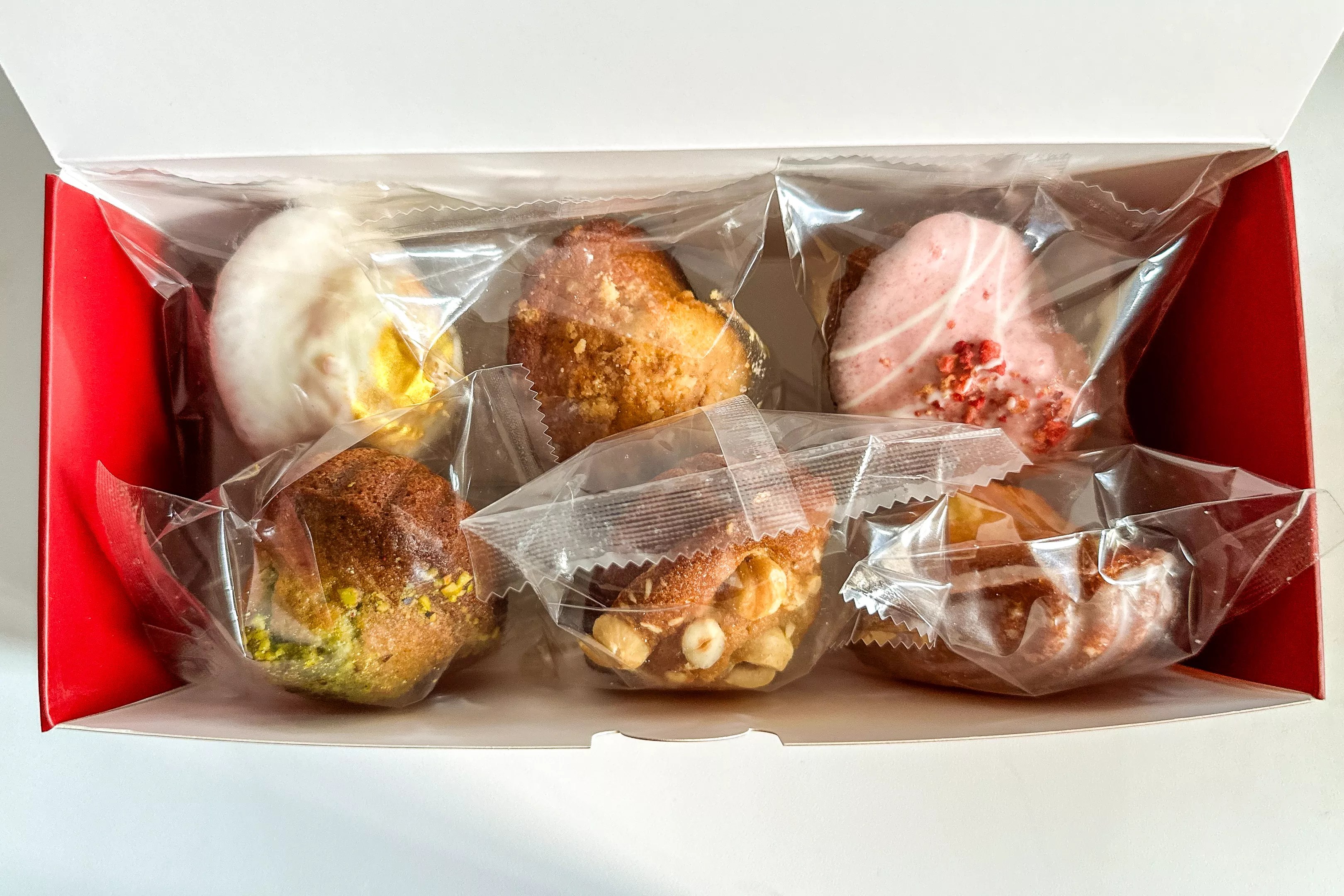Our half-dozen hall of madeleines included strawberry, pistachio raspberry, banana crumble and hazelnut.