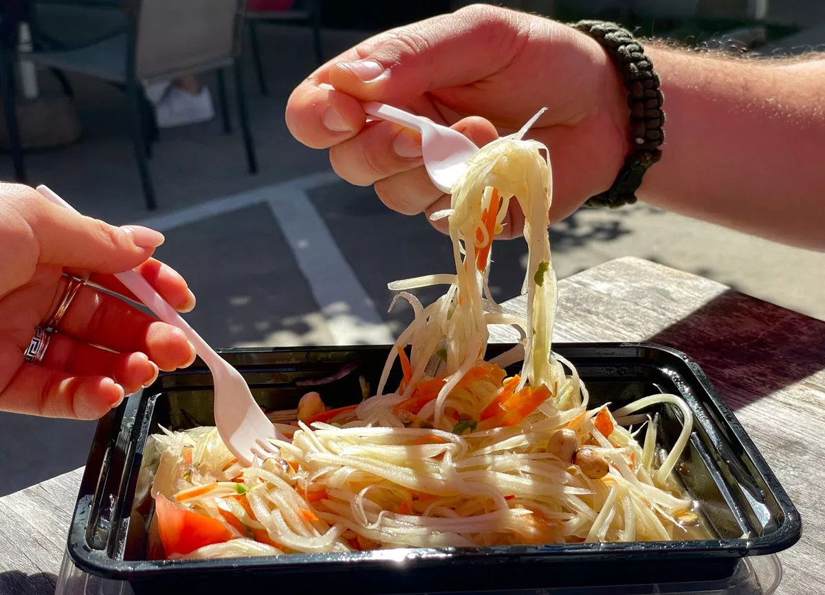 Each vendor has a little something different, but you’ll see a lot of green papaya salad, pad Thai, larb chicken salad, mango sticky rice, fried rice, egg rolls, meat skewers and even hot soup and curry. So, all the classics, but there’s plenty of opportunity to branch out.