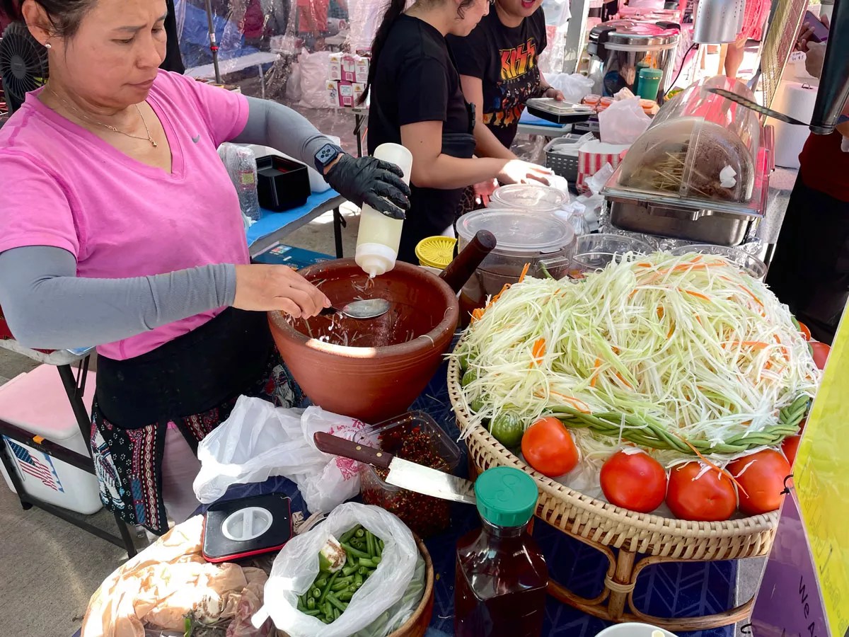 Each vendor has a little something different, but you’ll see a lot of green papaya salad, pad Thai, larb chicken salad, mango sticky rice, fried rice, egg rolls, meat skewers and even hot soup and curry. So, all the classics, but there’s plenty of opportunity to branch out.