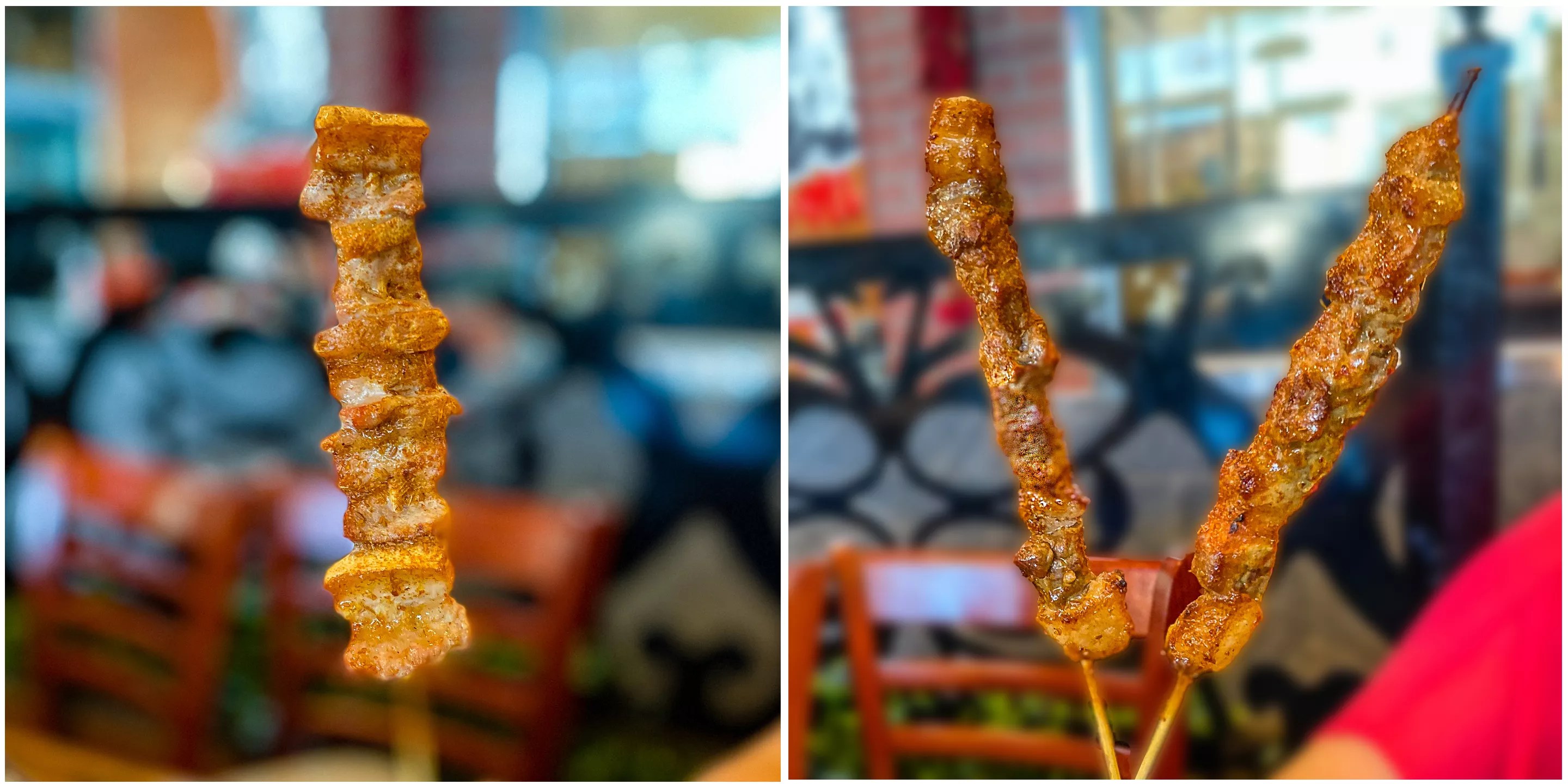 The sound of the sizzles and pops coming from the grill combined with the wisps of smoke and steam rising from the skewers provide a nice diversion and time killer while one waits for the food to arrive.