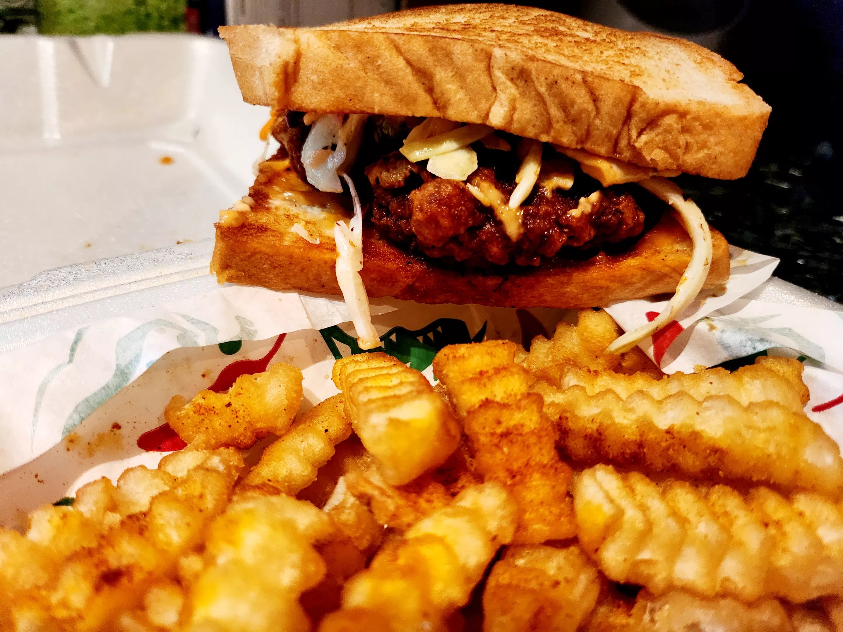 The Nashville chicken sandwich was on our list to sample, but we called a pre-snap audible here and instead opted for the Texan riff on the Nashville version: the Tex Ville chicken sandwich. Basically, it’s the Nashville chicken sandwich on what’s billed as Texas toast (as opposed to a brioche bun).