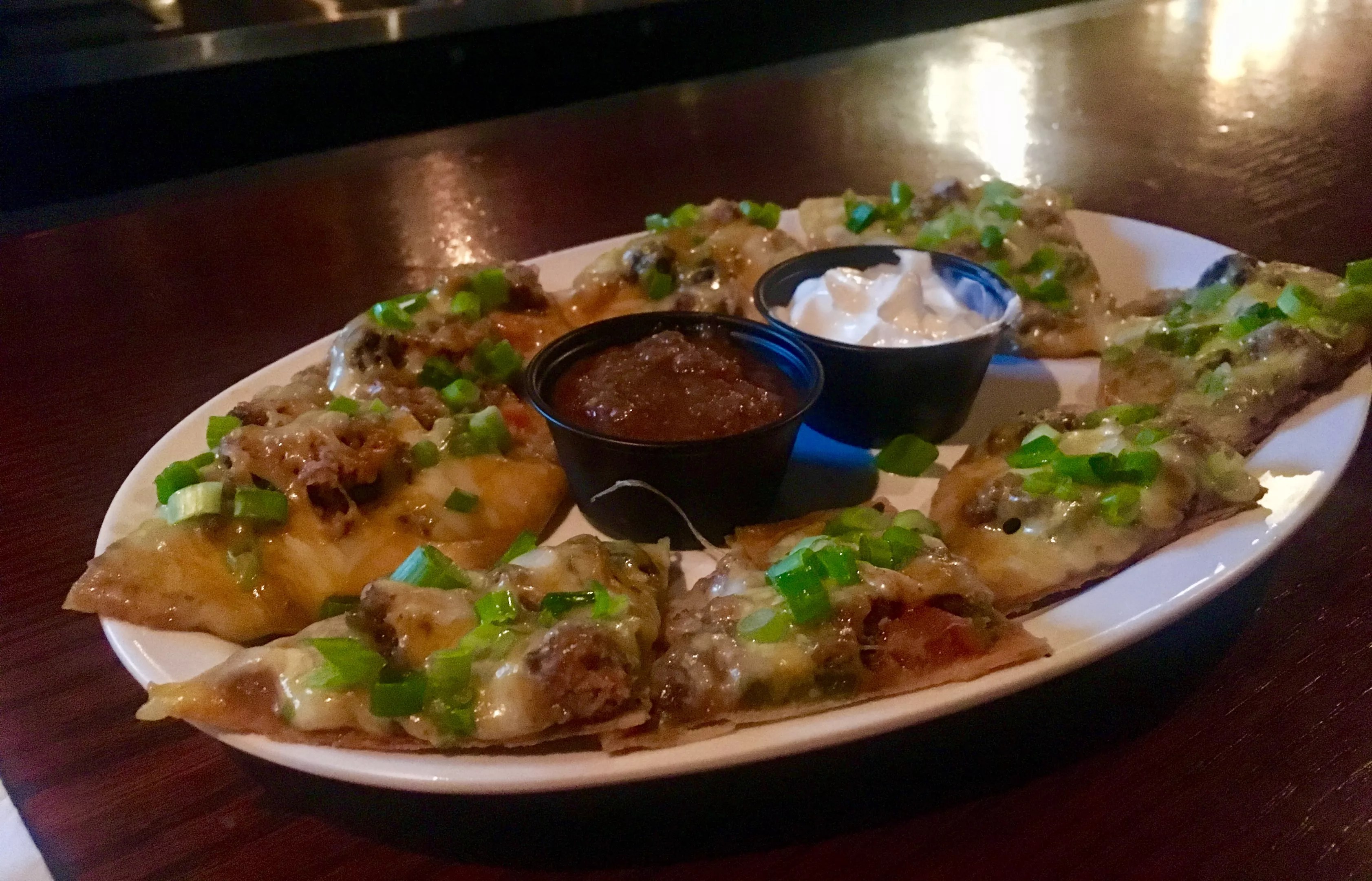 Green onions top each nacho chip for an herbal crunch, and they come with sour cream and salsa for dipping. Pair them with an ice-cold beer, and you’ll be in bar heaven.