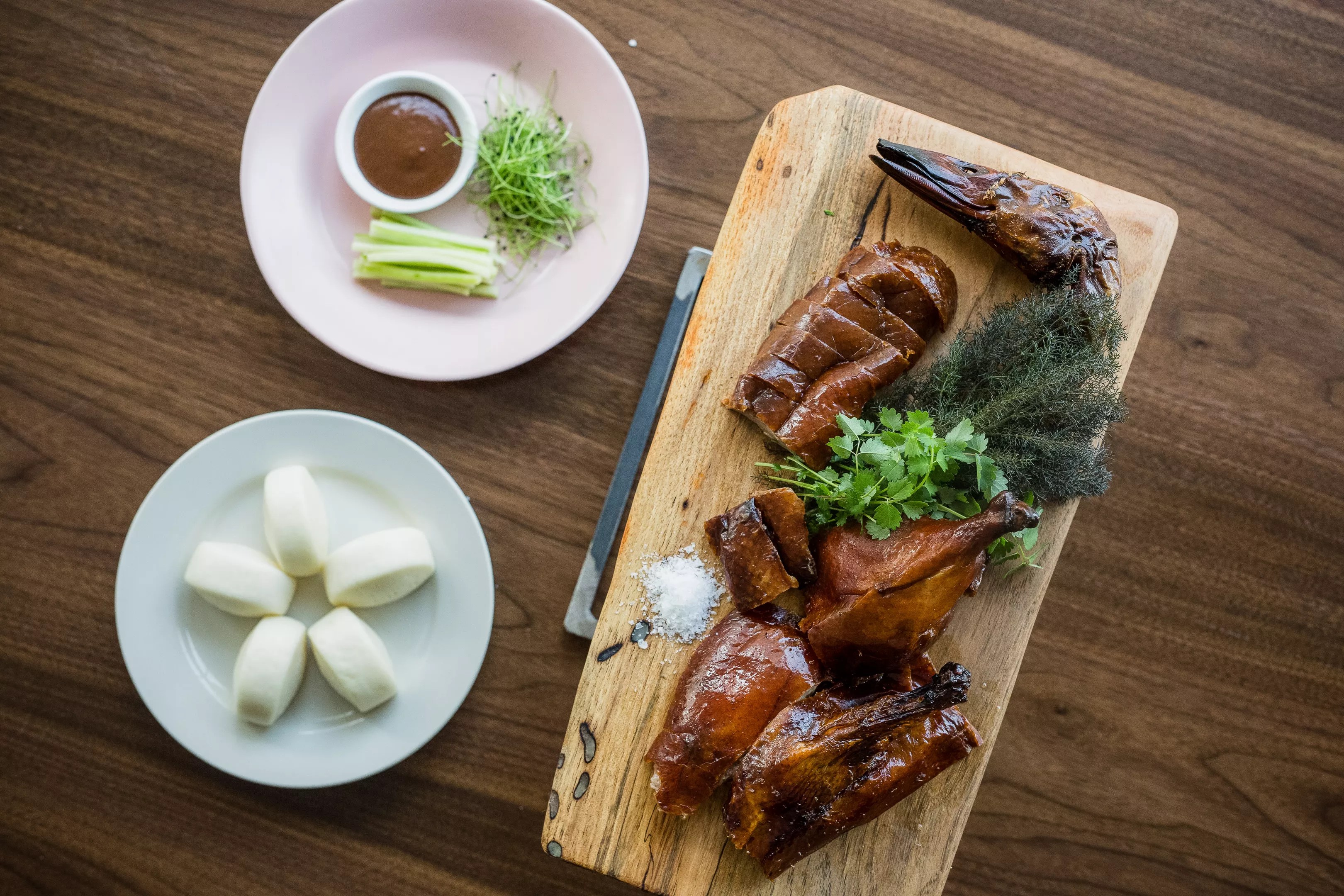 Fine China’s communal-style menu is “inspired by traditional Chinese cuisine and techniques” and delves into dim sum along with dishes like the Cantonese roast duck, which is “seasoned from the inside-out, then roasted in the restaurant’s duck oven, offering a unique visual for guests in the dining room,” according to a press release. “Available in whole or half portions, the Cantonese roast duck is served with cucumber, scallions, peach hoisin barbecue sauce (which Hernandez will change seasonally) and house made mantou.”