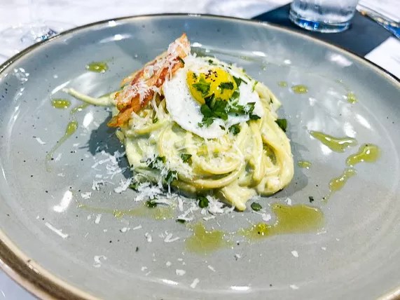 Spaghetti carbonara with a poblano cream sauce, guanciale and a poached quail egg.