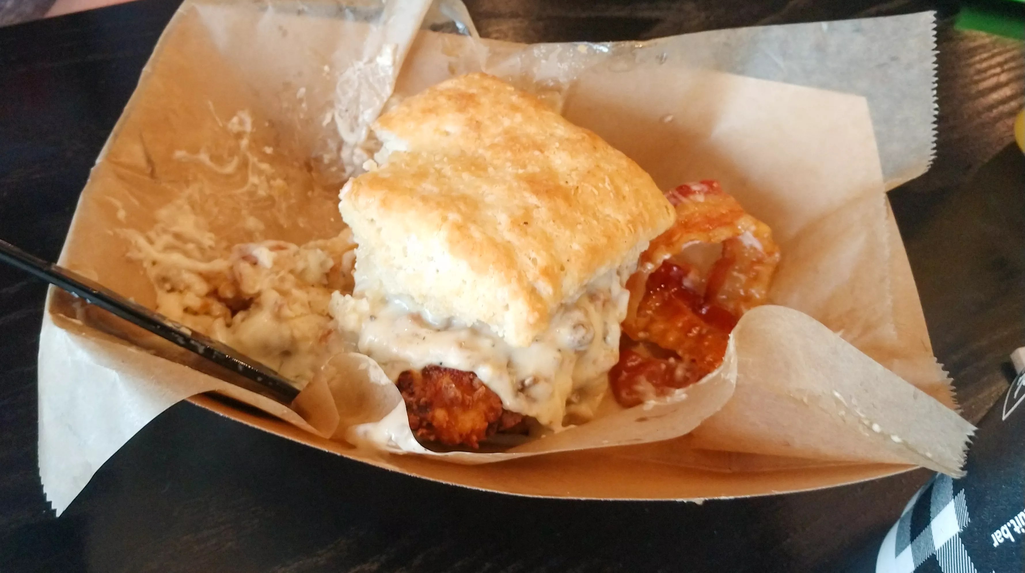 Biscuit Bar does the old-school, un-ironic kind of tots with toppings. The tots themselves are similar to what you get at Sonic, but who doesn’t like those? The problem here is the cheese. I don’t know what cheeses “melted cheese blend” is made of, but I do know they’re found in a stadium.