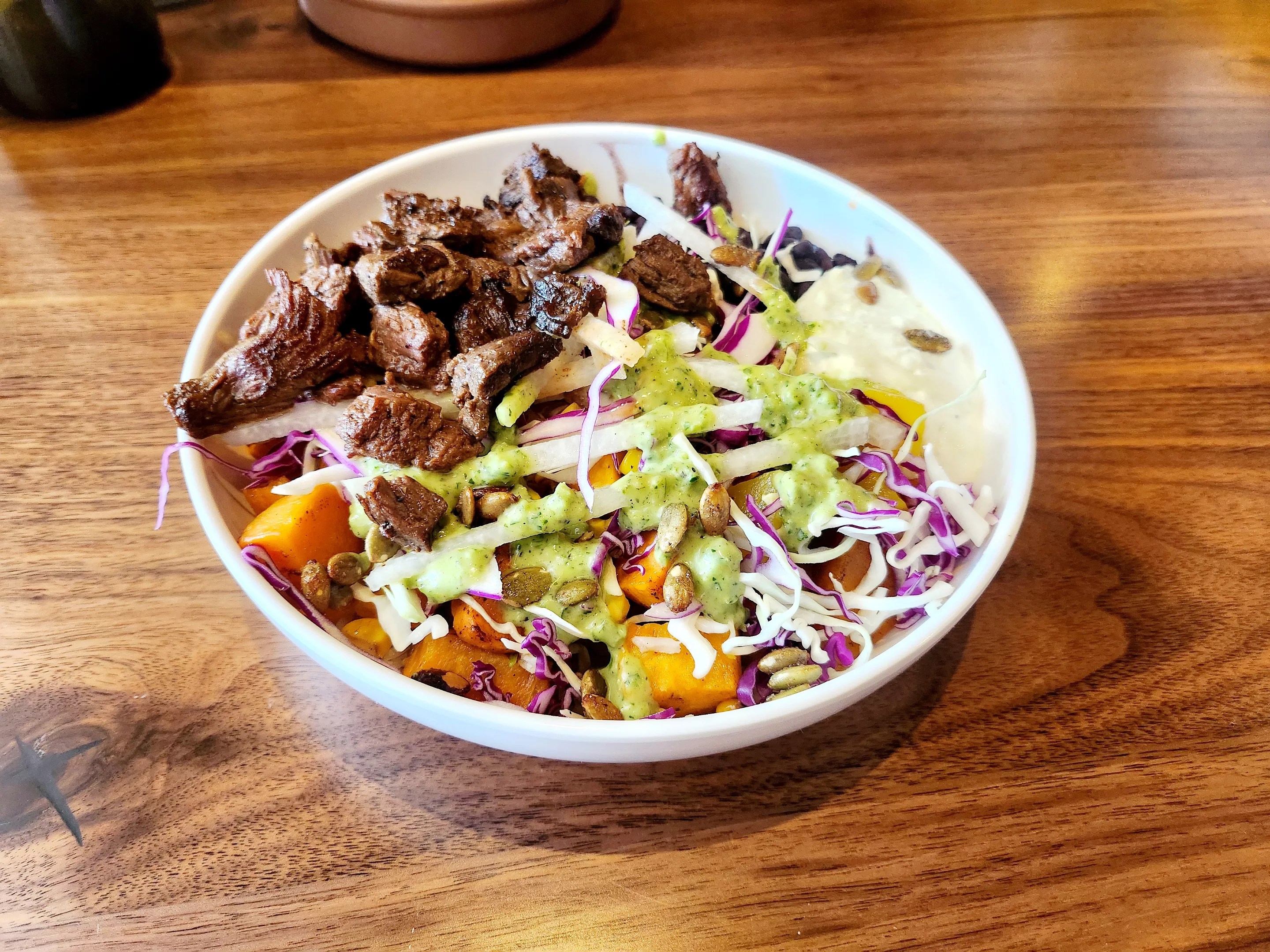 We opted for the Sedona Bowl ($17) with asada grass-fed beef (additional $8). This bowl was a gorgeous, flavorful medley of black beans, sweet potato, pickled golden beets, roasted corn, cabbage slaw, jicama, ginger pepitas, jalapeño ranch and queso crema served over fluffy cilantro rice. The menu offers six other bowl choices, plus a build-your-own option.