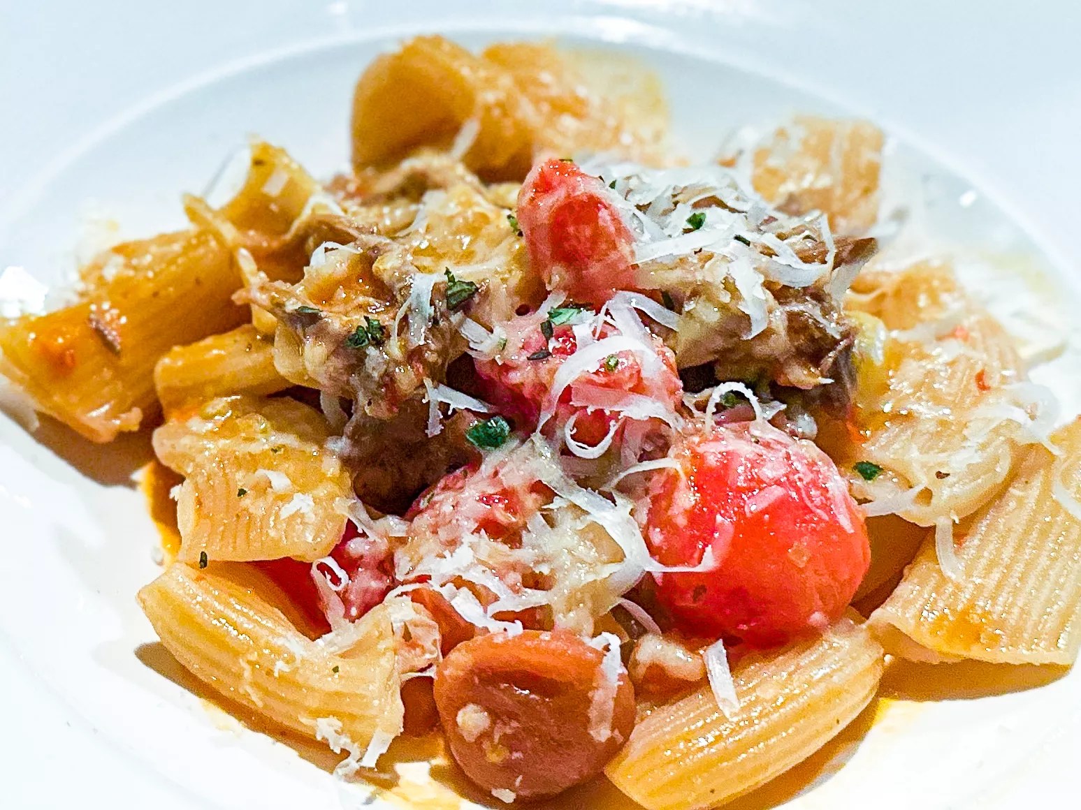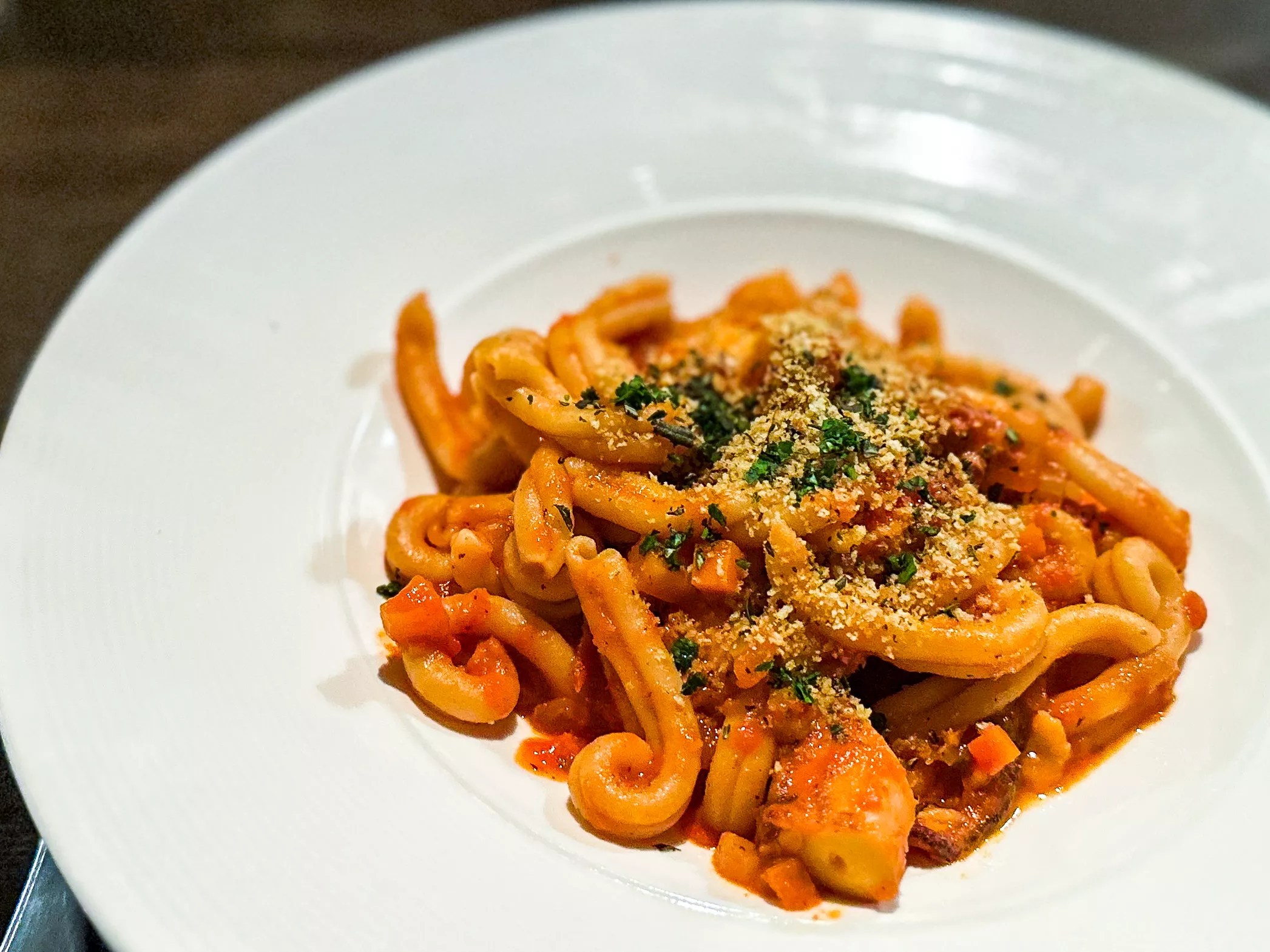 Casarecce arrabiata: braised octopus, arrabbiata, bone marrow and citrus bread crumbs.