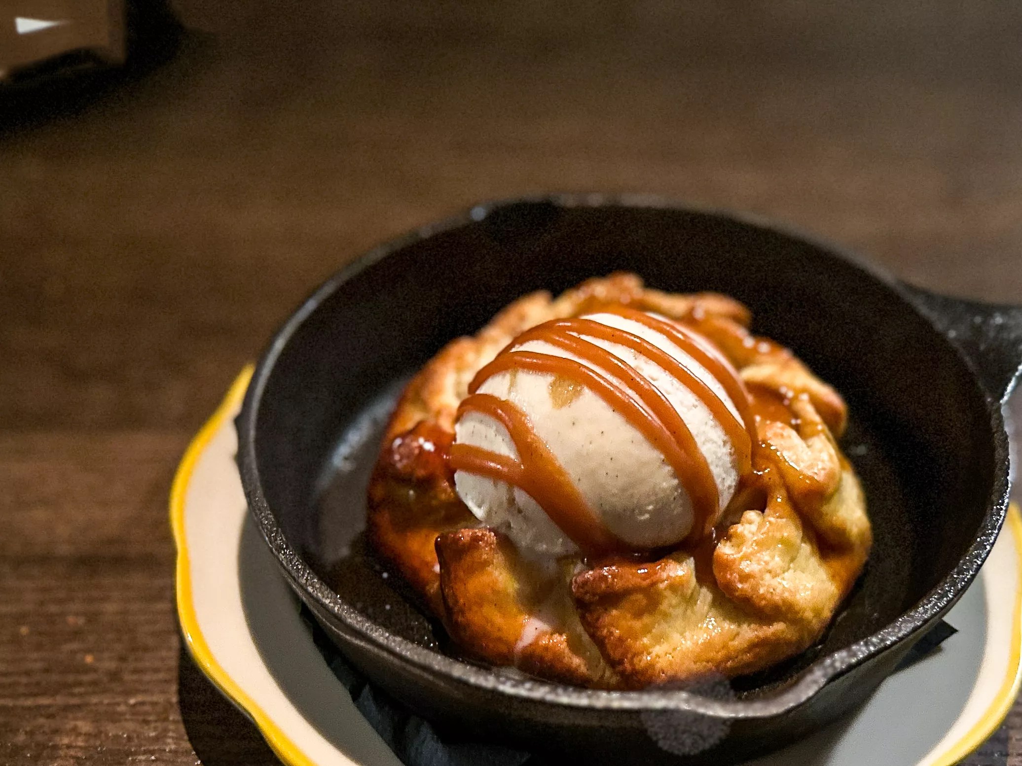 The dolce selection was an apple crostata, prepared with brown butter, with a dollop of gelato garnished with salted caramel sauce served in a very warm little cast iron skillet. Two spoons and just enough.