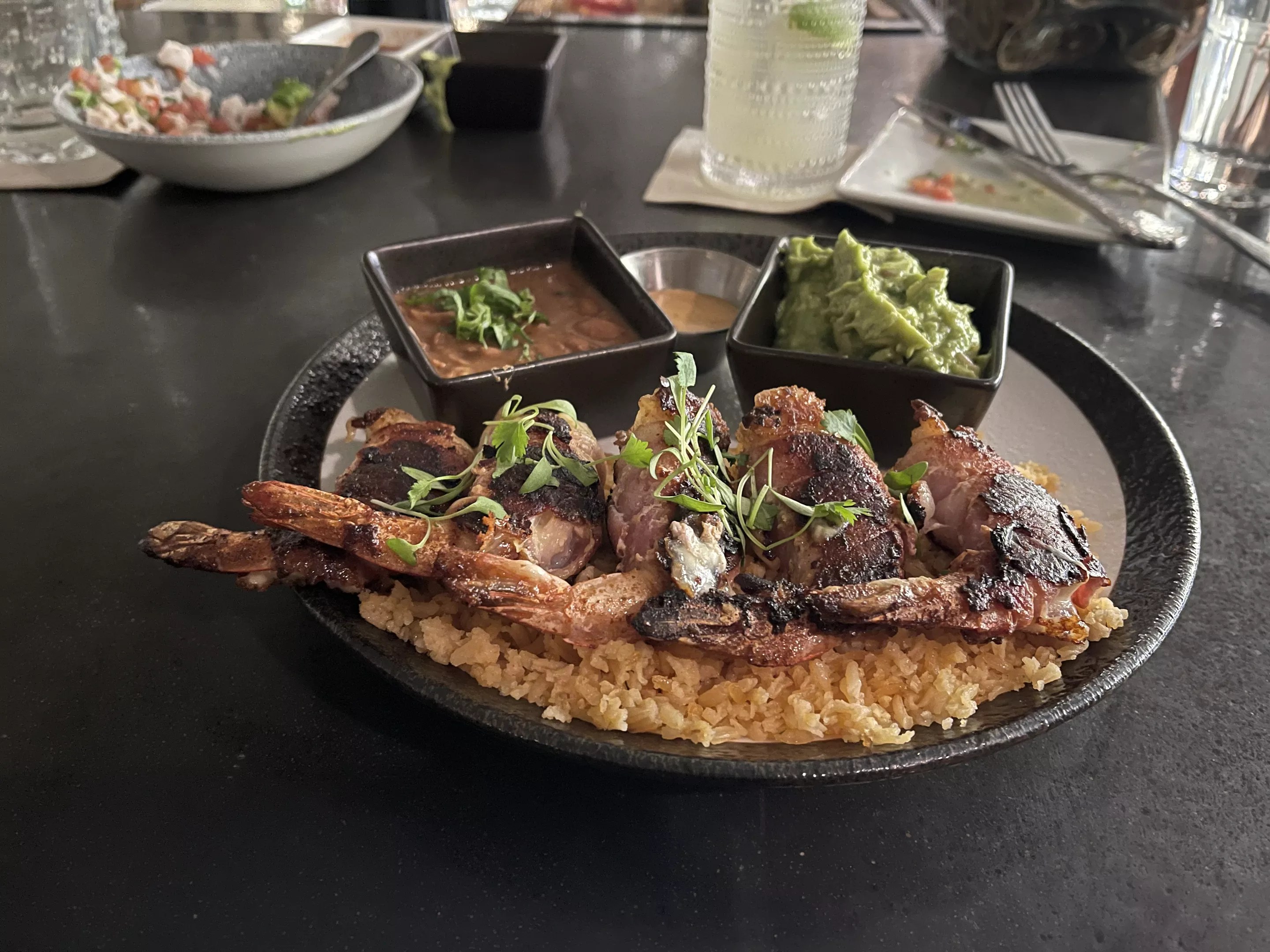 The brochetas modernas ($18) are bacon-wrapped white Pacific shrimp, stuffed with Jack cheese and jalapeños (see photo at top). It takes talent to pull off this dish and ensure the bacon is crispy while not overcooking the shrimp.
