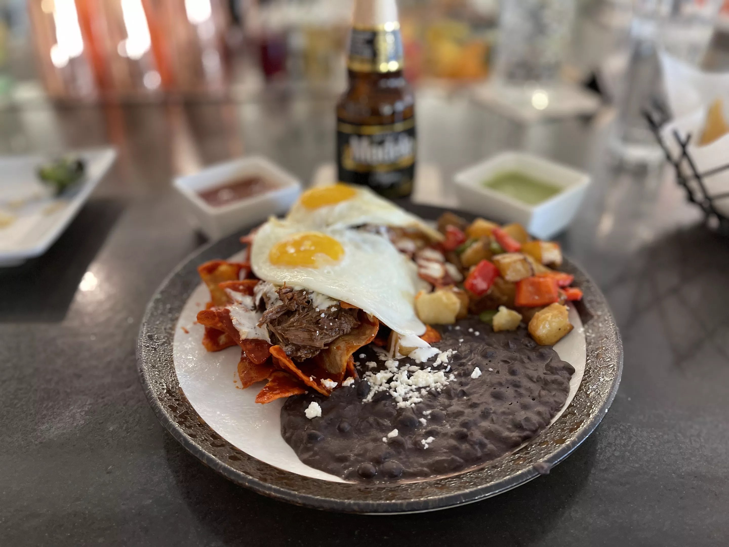 We also tried the chilaquiles ($13), a stack of their homemade tortilla strips topped with roasted chicken and your choice of rojos or mole sauce and topped with a sunny side up egg, crema and queso fresco.