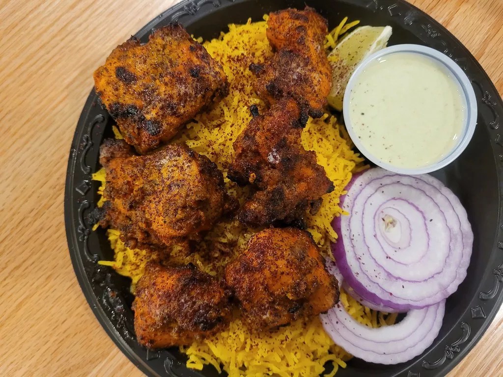 For chicken dishes (yes, they have chicken here), try their signature ‘Holic chicken kebabs made with charred marinated cubes of chicken breast, sprinkled with sumac and served over fluffy yellow long grain rice. The added sparkle of melted butter with a side of yogurt mint sauce and slices of raw red onion are a must.