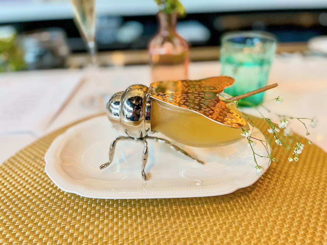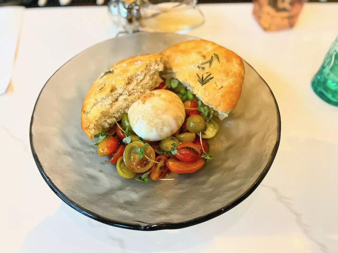 Fiatto’s signature cocktail is the Queen Bee ($12), a refreshing gin-based cocktail with herbal tea, honey and lemon served in a bee-shaped glass with a spray of tiny white flowers for garnish. The Cosmo Royale ($12) is served with Citron vodka, cranberry, orange and Italicus liqueur, the latter of which adds an aromatic flavor to balance the fruit. Caprese salad with focaccia Angie Quebedeaux