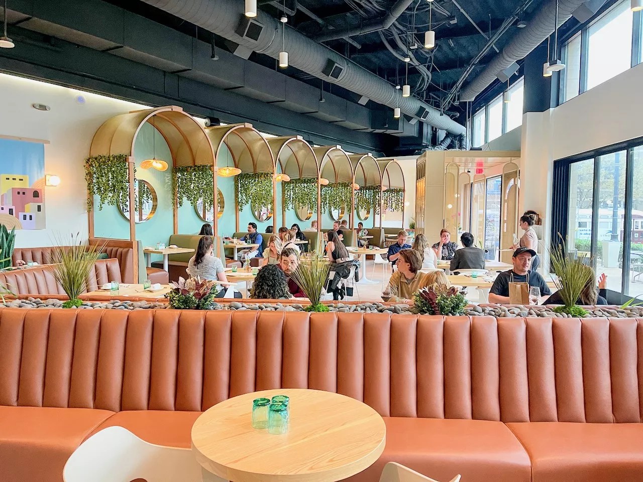 We checked it out on a recent Tuesday evening and by the looks of it, the secret is out. We arrived for an early dinner around 6 p.m., and there were only a few tables left. We sat at the bar and were immediately greeted by the bartenders who were whipping up a variety of unique cocktails. The décor has a coastal vibe with bright pops of color, natural wood and a flood of natural light with floor-to-ceiling windows.