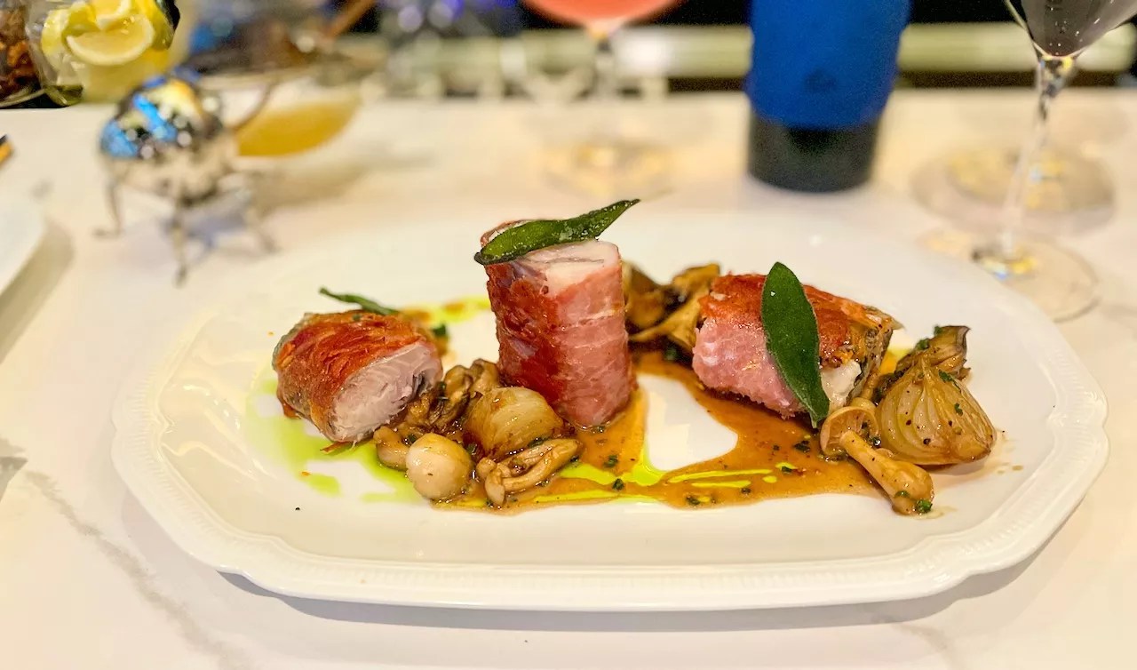 For the main entrée, we tried the trout saltimbocca ($27). Four pieces of filleted trout are wrapped with prosciutto and served with cippolini onions and mushrooms in a marsala sauce. The prosciutto gives the fish a nice salty crunch as you bite into it and the onions and mushrooms add a nice touch to the light Marsala sauce.