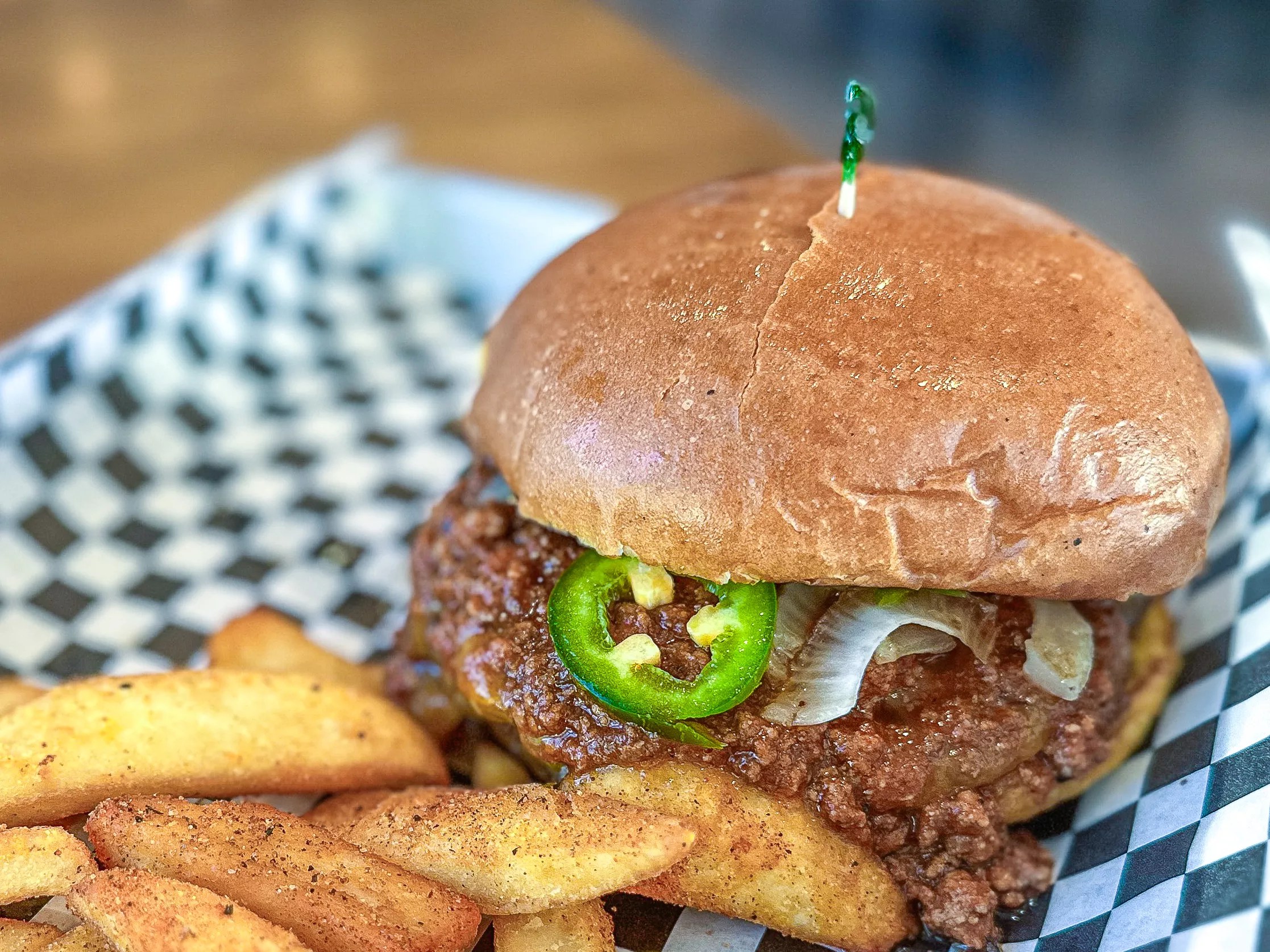 The burgers are relatively inexpensive (a simple classic burger can be had for $7) but are served Á la carte and seem to be about half a pound of good-quality beef. We settled on two specialty burgers, a chili cheeseburger and a jalapeño burger, both at $10. The chili cheeseburger is topped with homemade chili, shredded cheddar cheese, fresh jalapeños and tobasco onions. Hank Vaughn