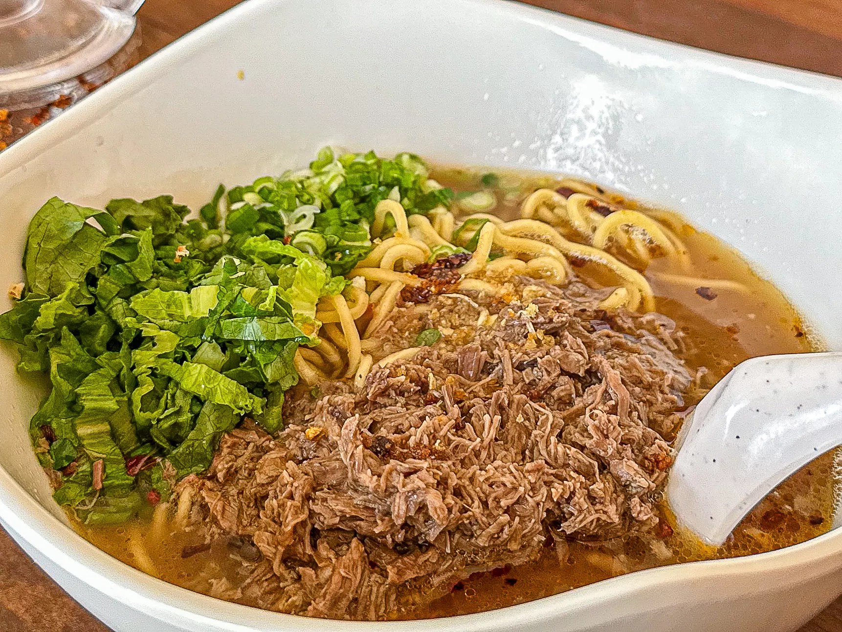 It arrived in a large bowl, piping hot, with chopped lettuce, chili oil and green onions added. The birria was plentiful and tender, the noodles the right amount of chew, the broth rich and complex but not overpowering.