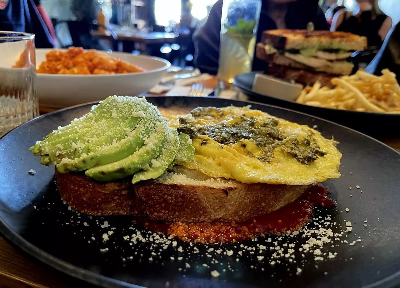 Since it was brunch, we sampled a few plates from both the breakfast and lunch menus. We started with the Sambal Scramble ($18). Soft scrambled eggs with avocado (you can opt for bacon over avocado), parmesan and green harissa on sourdough, all lying atop a spicy chili sambal sauce.